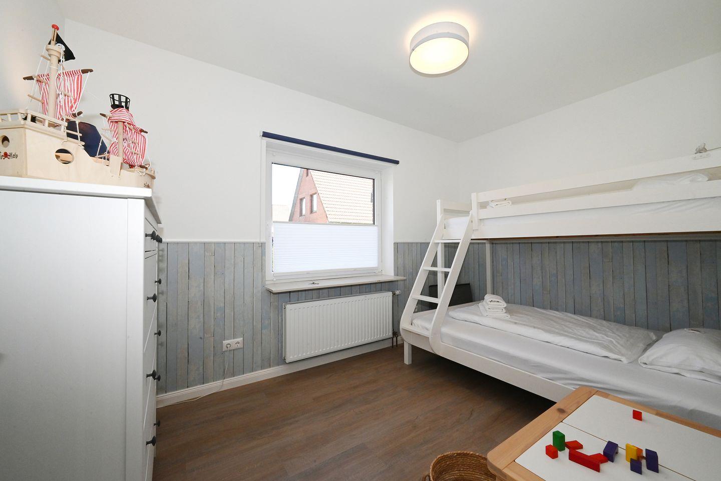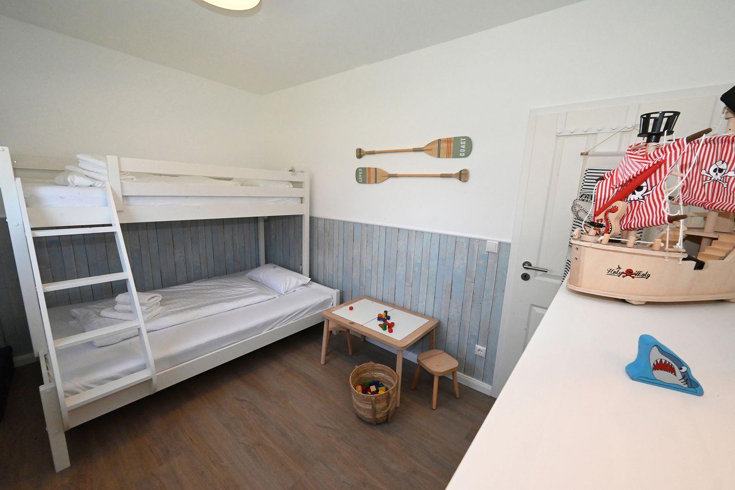 Im Kinderzimmer befindet Sich ein Hochbett, welches in der unteren Etage 1,40x 2,00 Meter und in der oberen Etage 0,90 x 2,00 Meter groß ist.