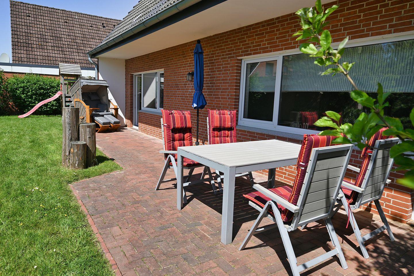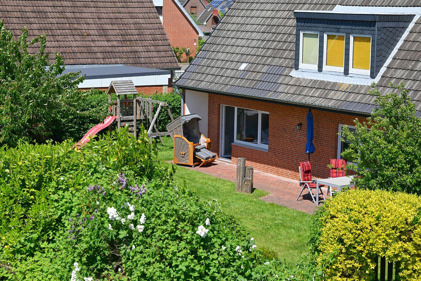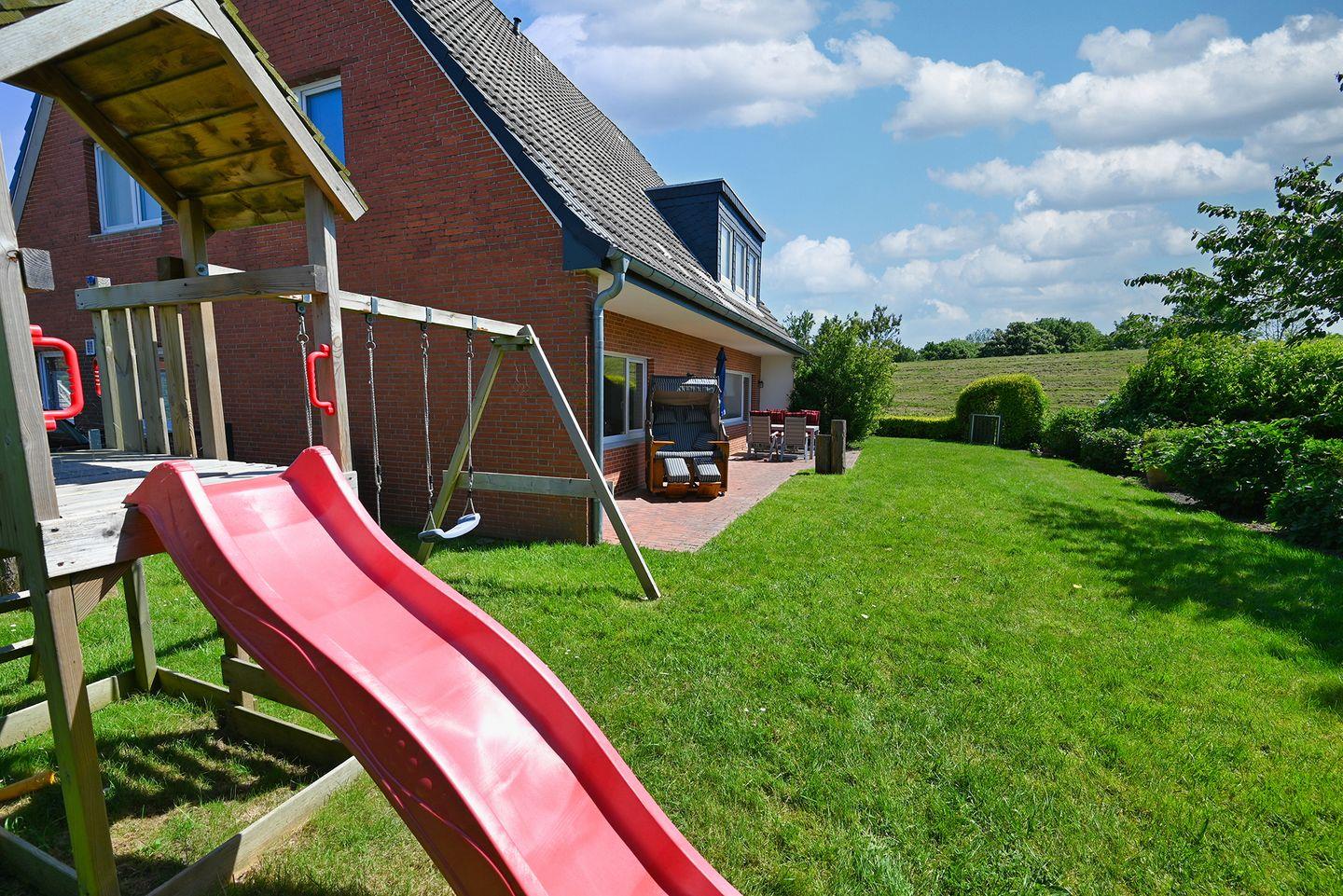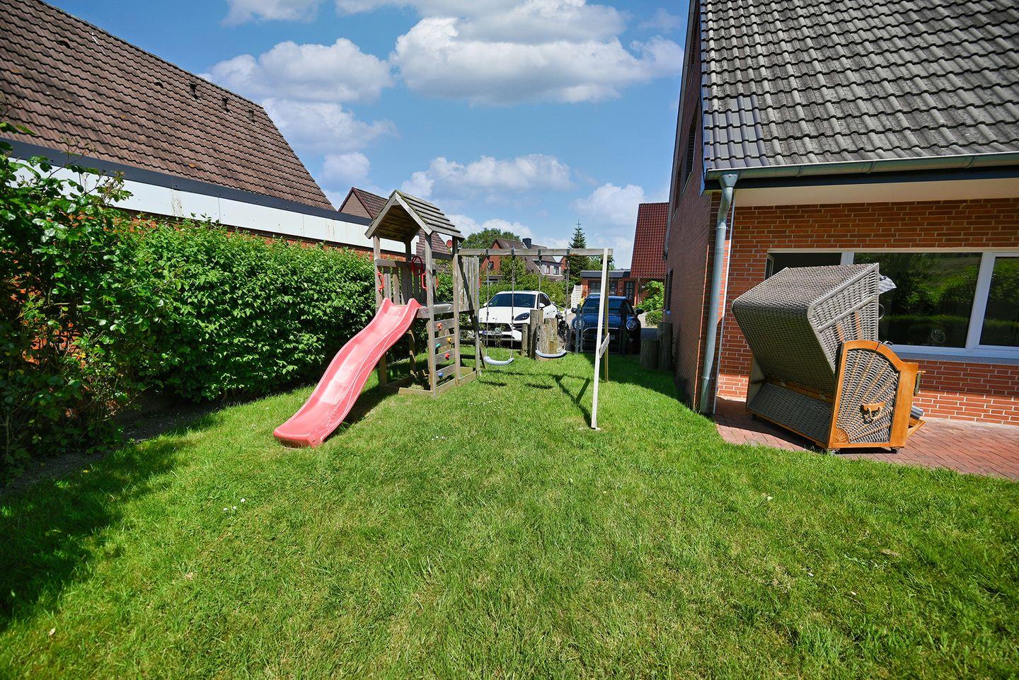 Das Highlight der Wohnung ist der Garten für entspannte Stunden. Sie bietet eine schöne Terrasse mit Gartenmöbeln und einem Strandkorb. An die Kinder wurde auch gedacht: Hier finden Sie einen Schaukel sowie eine Rutsche die Kinderherzen höher schlagen lässt.