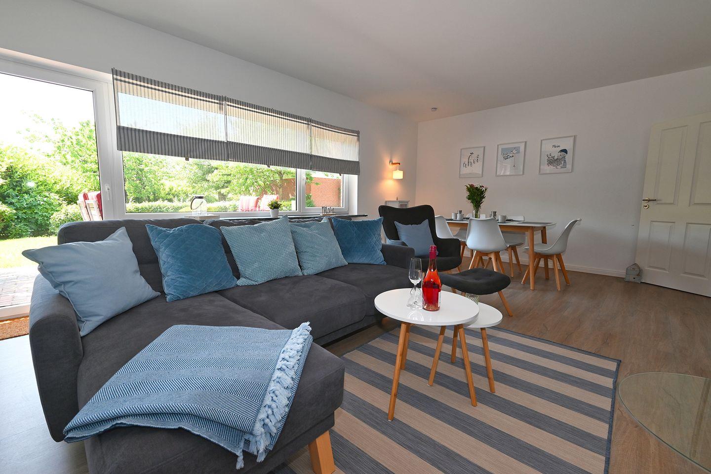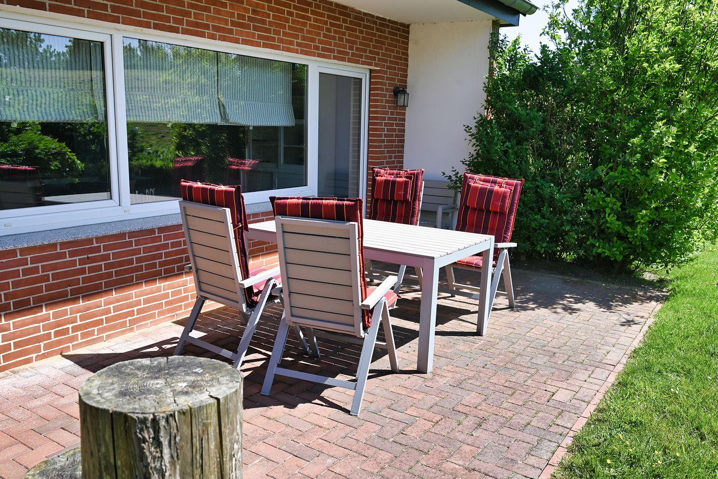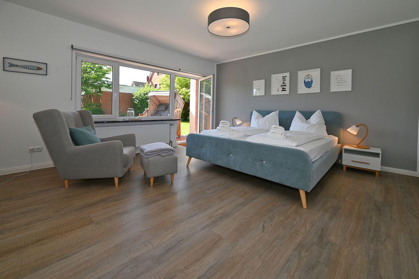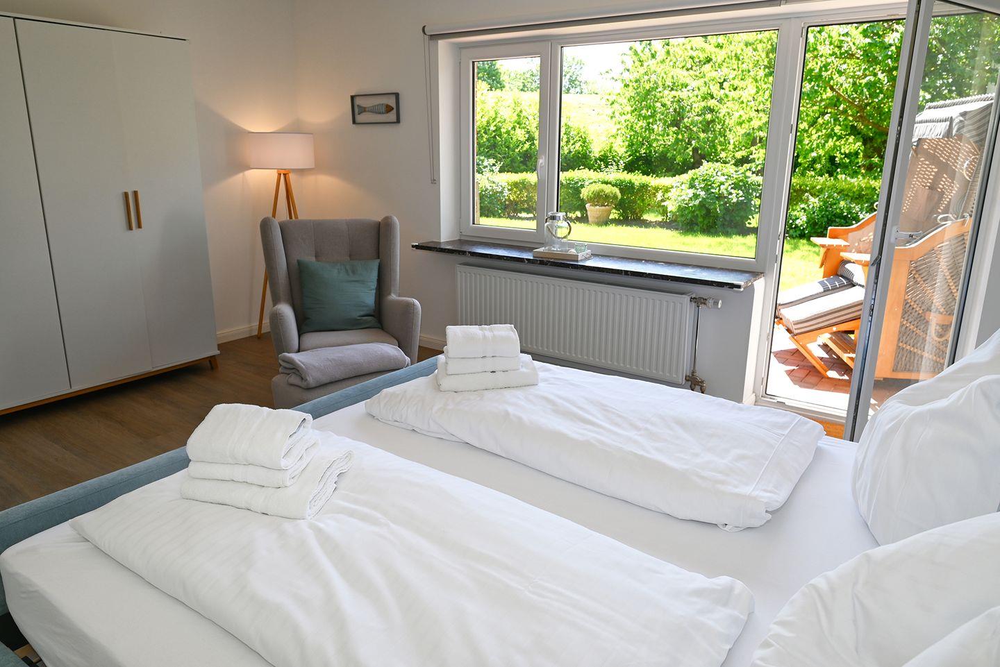Das Highlight der Wohnung ist der Garten für entspannte Stunden. Sie bietet eine schöne Terrasse mit Gartenmöbeln und einem Strandkorb. An die Kinder wurde auch gedacht: Hier finden Sie einen Schaukel sowie eine Rutsche die Kinderherzen höher schlagen lässt.