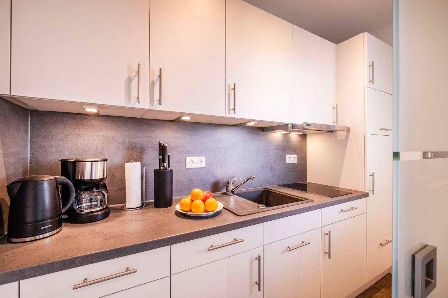 Küchenzeile: Cerankochfeld, Mikrowelle, Geschirrspüler, Kühlschrank mit Gefrierfach