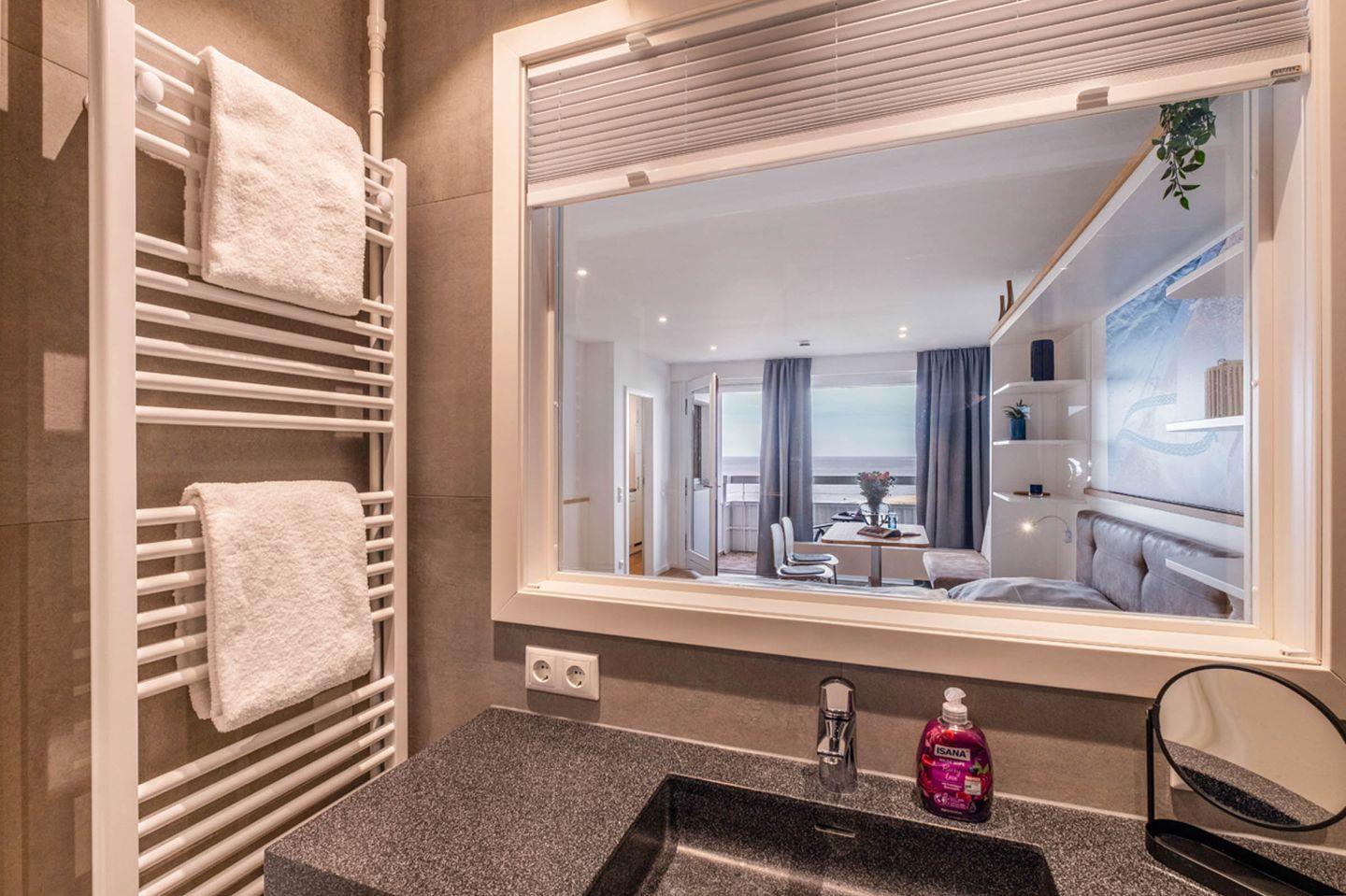 Die Ferienwohnung Nr. 86 (MeerLounge) befindet sich im 8. Obergeschoss des Büsumer Hochhauses und verfügt über einen fantastischen Meerblick über die Familienlagune. Dieses gemütliche Ein-Raum-Appartement ist in 2023 so saniert worden, dass es wirklich alles für Ihren Urlaub bereit hält. Das sonnige Wohn/Schlafzimmer verfügt über eine gemütliche Sitzgarnitur, TV und ein hochwertiges Doppelbett. Eine separate kleine Küche rundet dieses gelungene Appartement, das auch über einen Abstellraum verfügt, ab. Das Highlight der Wohnung ist das Bad mit Panorama-Sichtfenster Richtung Balkon.