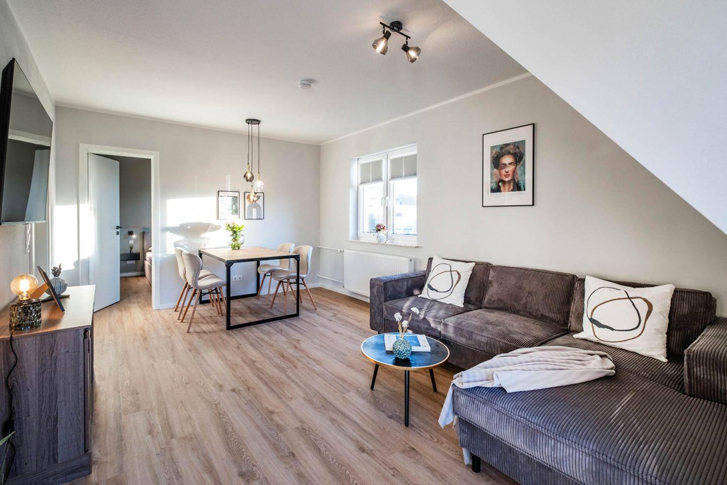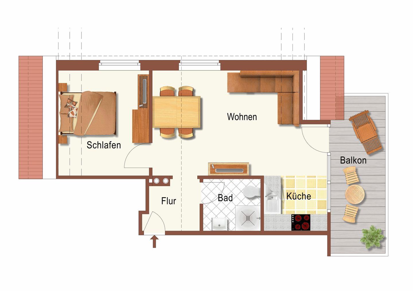 1 Wohnzimmer mit Essbereich, eine kleine Küchenzeile, 1 Schlafzimmer und 1 Duschbad
