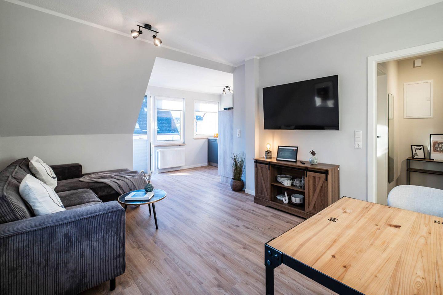 Haus Bielshövensand 15 App. Vintage in Büsum bietet auf 43 m² ein Schlafzimmer, einen offenen Wohn- und Essbereich mit voll ausgestatteter Küche, Balkon mit Gartenblick sowie modernes Bad mit Dusche. WLAN, Spülmaschine, zwei Smart TVs und gemeinschaftliche Waschmaschine sorgen für Komfort. Einkaufsmöglichkeiten, Restaurants und der Strand sind in wenigen Minuten fußläufig erreichbar. Bäcker und Edeka in 250m erreichbar. Ruhige Wohngegend für einen erholsamen Urlaub.
