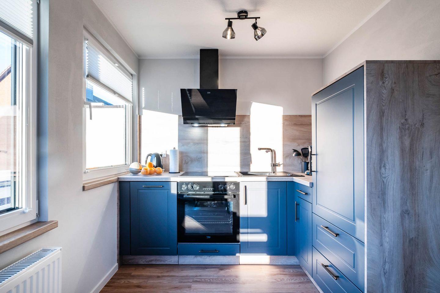 Küchenzeile: Geschirrspüler, Kochfeld, Backofen, Kühlschrank mit Gefrierfunktion, Heißwasserkocher, Kaffeemaschine, Toaster.