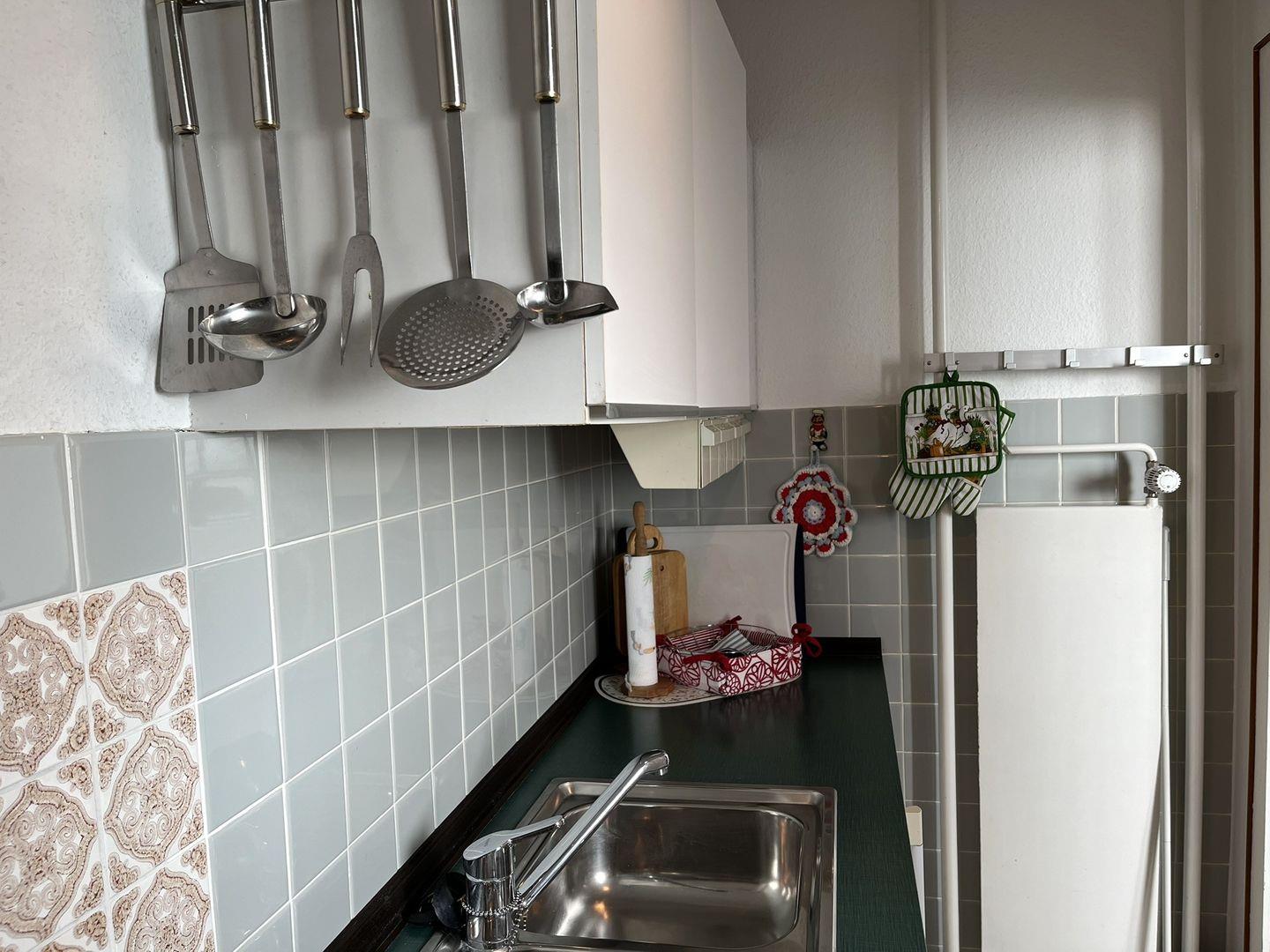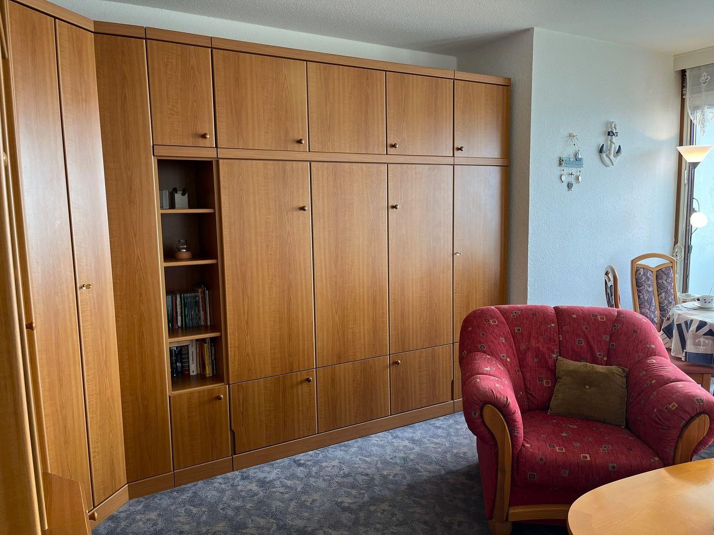 In dem gemütlichen Wohnraum befindet sich neben dem Sofa und einem Sessel auch der Esstisch mit Meerblick. Ein Schrankbett (1,40x 2,m) bietet einem weiteren Gast eine Schlafmöglichkeit