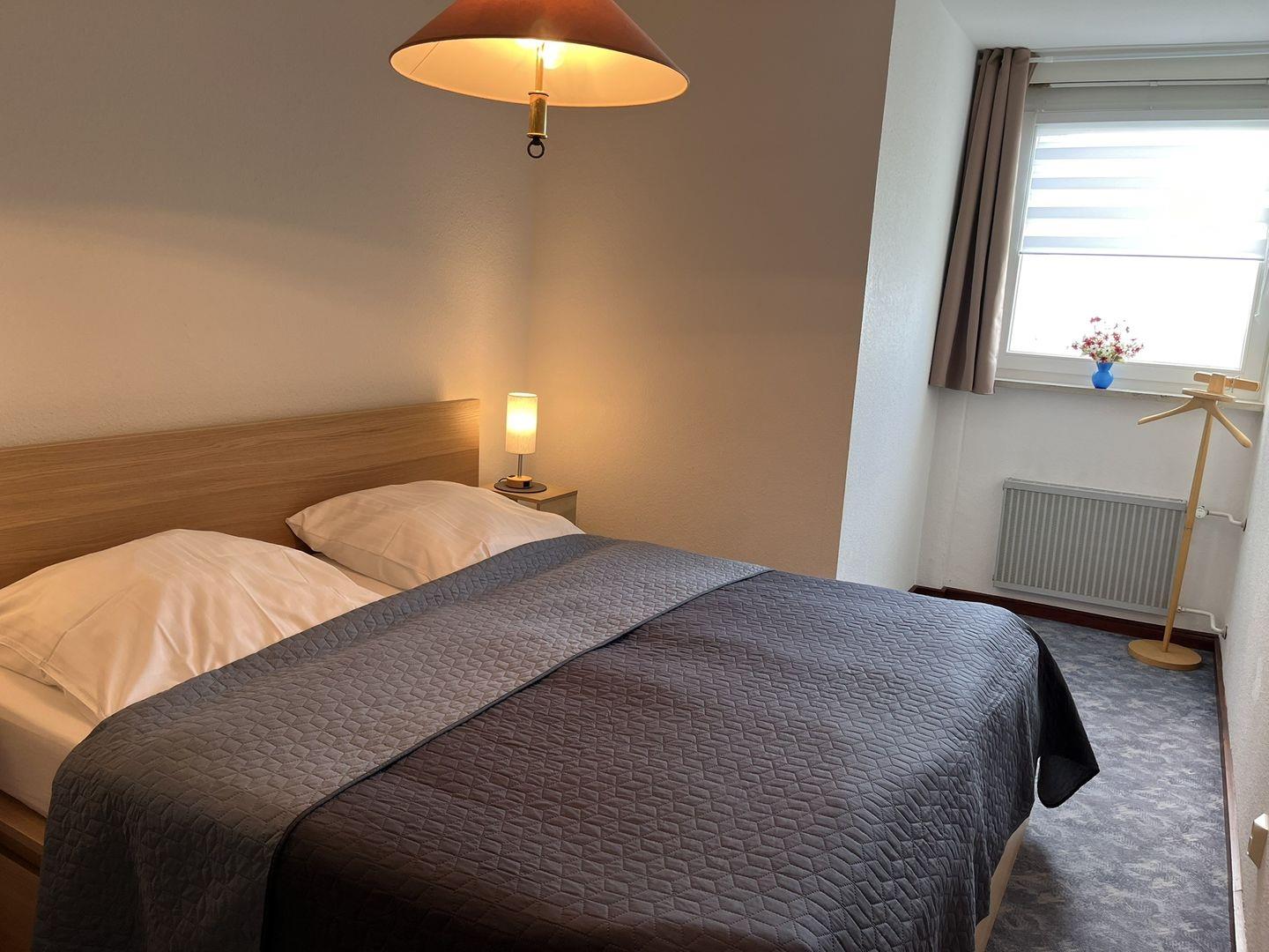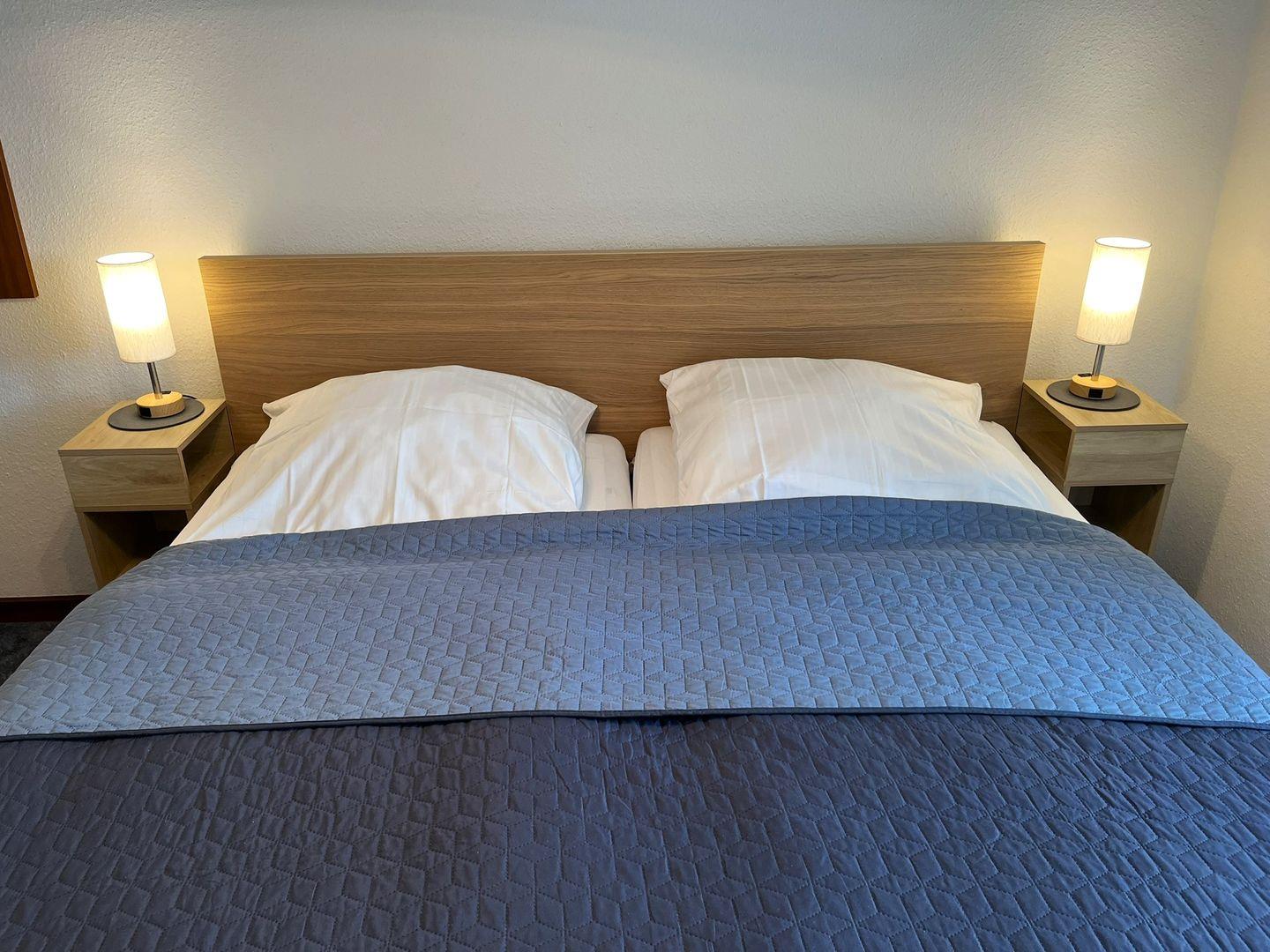 Das Schlafzimmer ist mit einem Doppelbett (2 Einzelmatratzen) und einem Kleiderschrank möbliert und bietet auch genügend Platz um dort ein Babybett aufzustellen, dass man dazu buchen oder selber mitbringen kann.