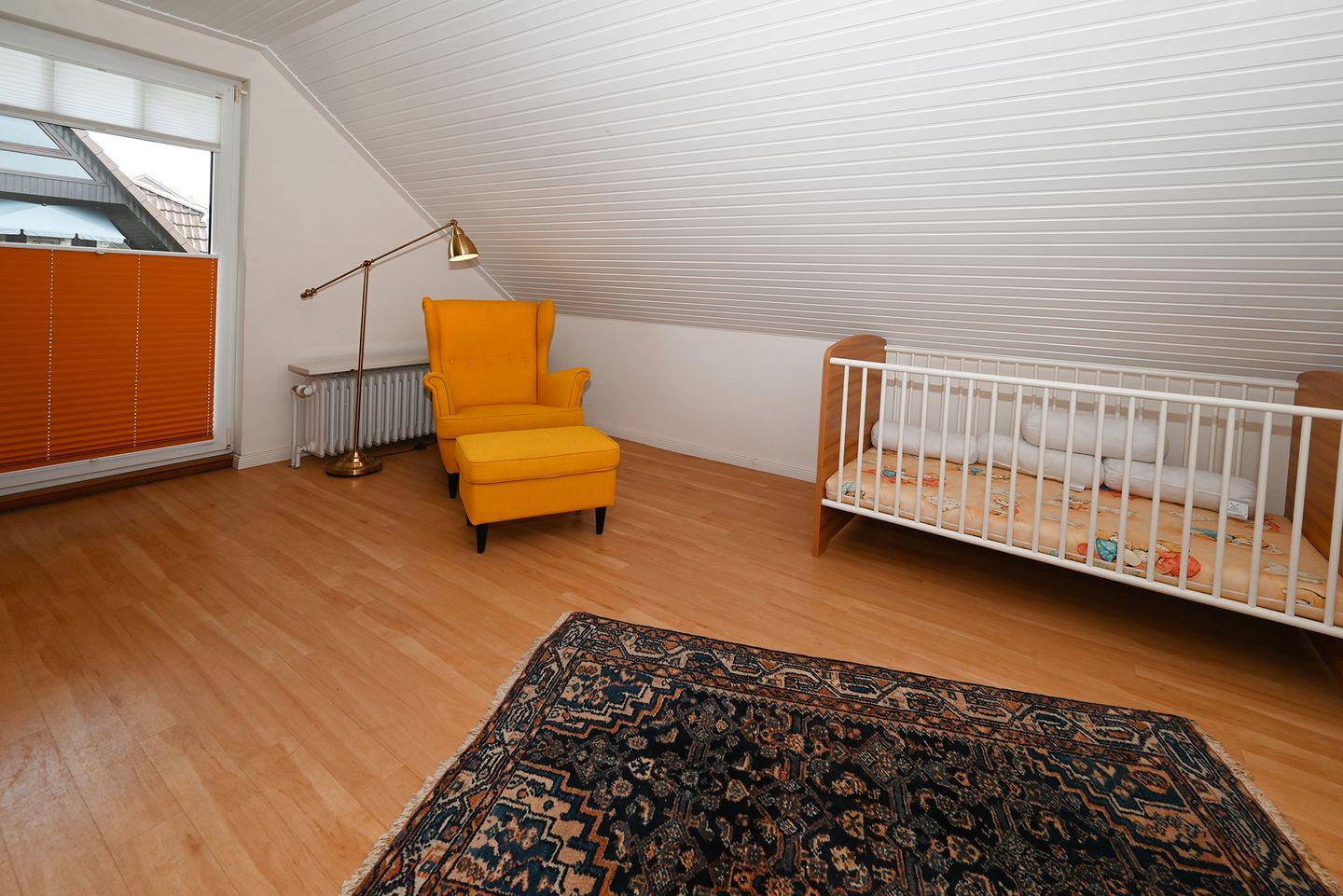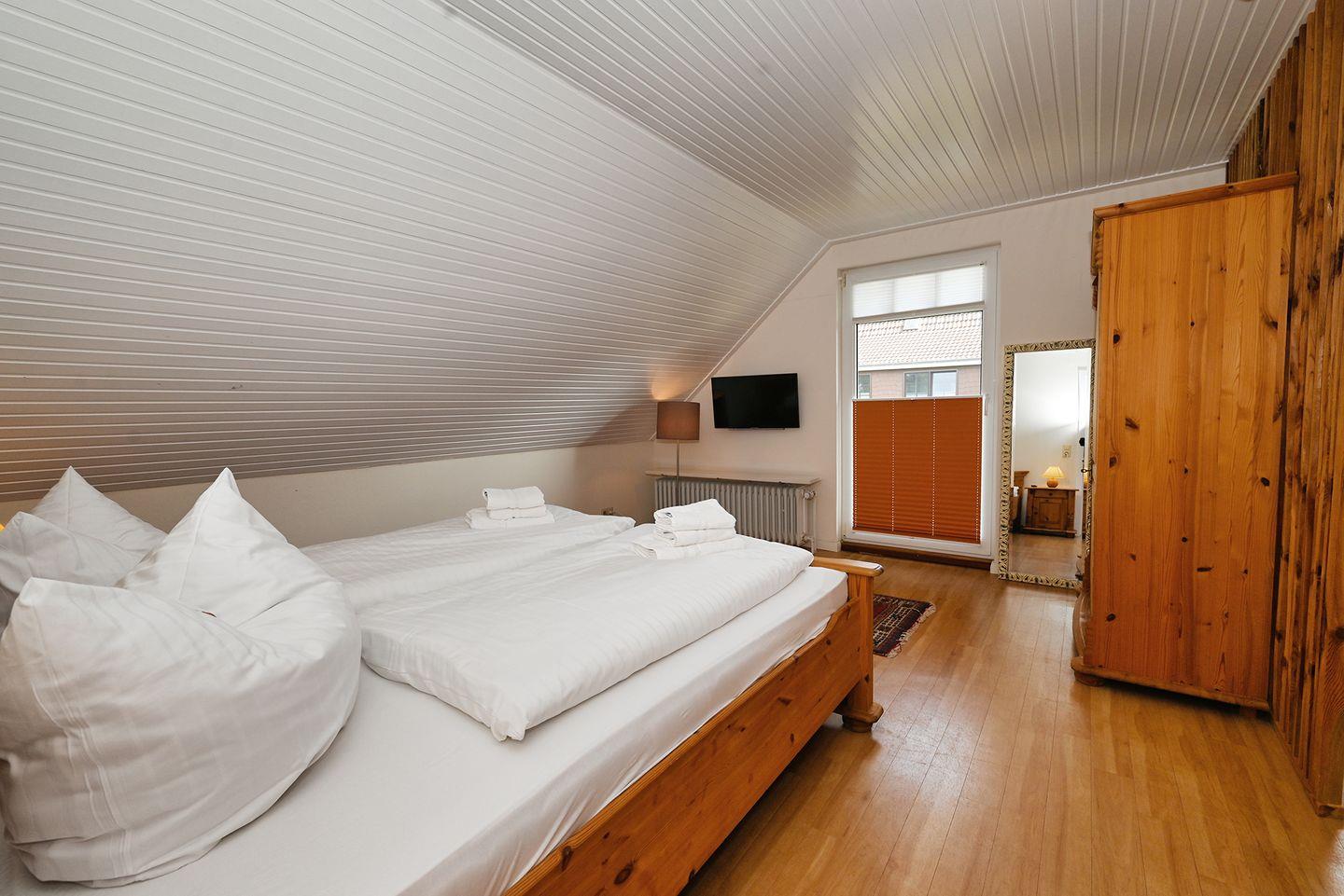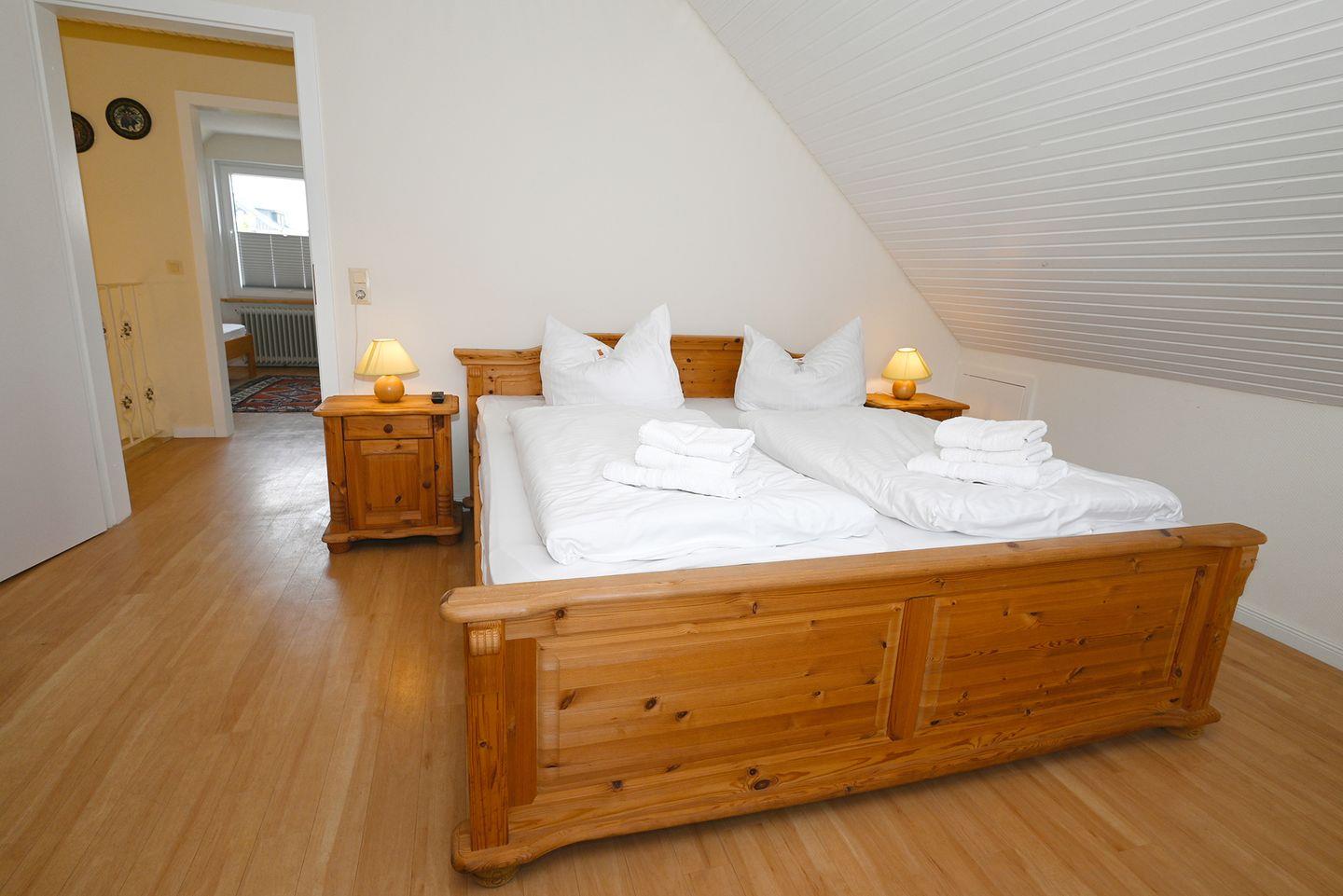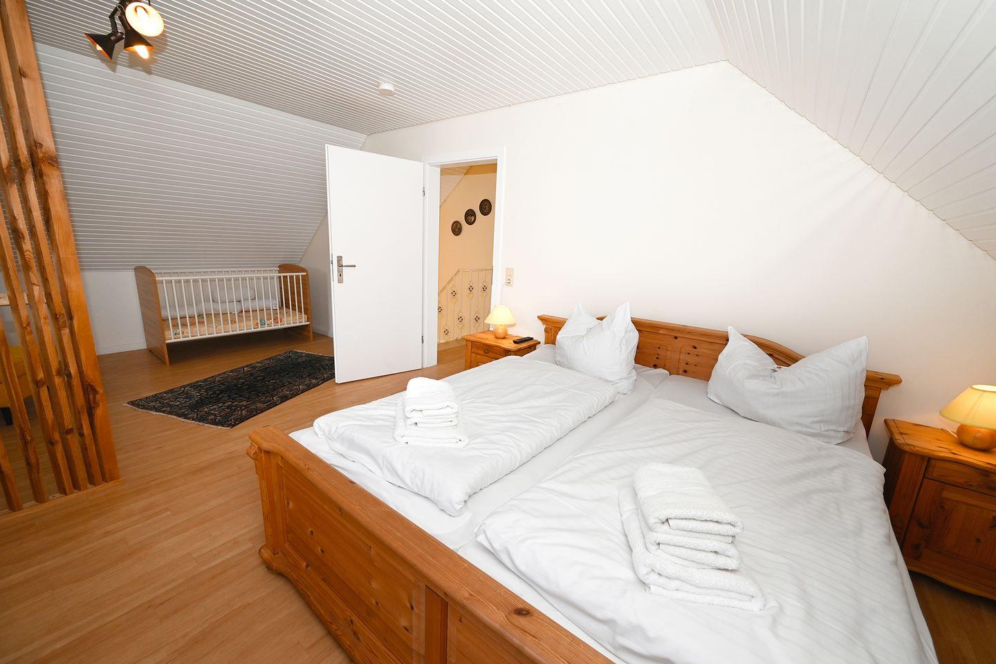 Die im Obergeschoss gelegenen Schlafzimmer verfügen über 2 Doppelbetten - die beide eine Größe von 1,80 x 2,00 Meter haben. Das Elternschlafzimmer verfügt
