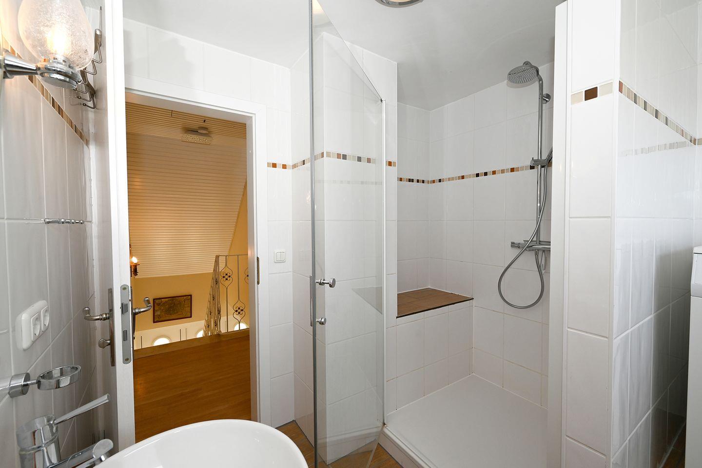 Das ebenfalls oben liegende Badezimmer ist mit einer Dusche ausgestattet. Gegen einen kleinen Aufpreis kann die eigene Waschmaschine und der Trockner benutzt werden.