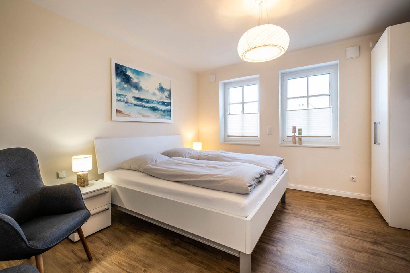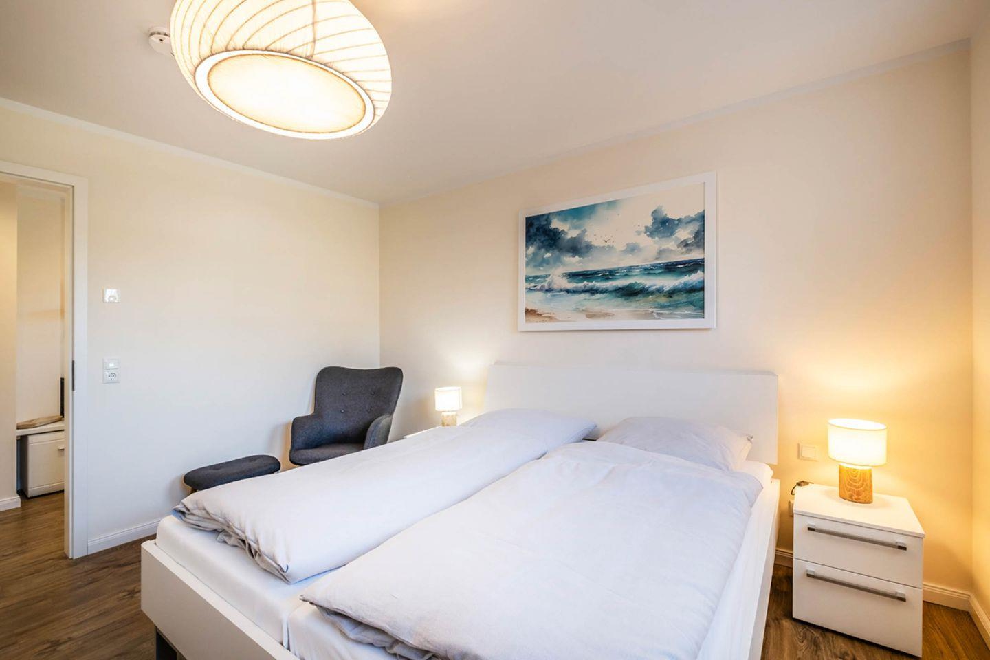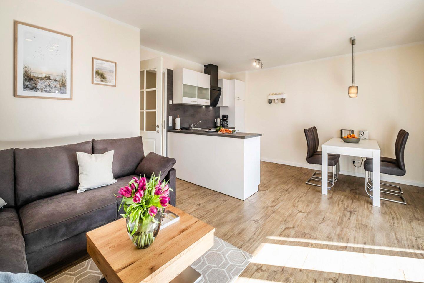 Die Wohnung besteht aus einem gemütlichen Schlafzimmer, einem modernen Badezimmer und einem offenen Wohn- und Essbereich. Im Schlafzimmer erwartet Sie ein komfortables Bett, das Ihnen erholsame Nächte garantiert. Das Badezimmer ist mit einer bodengleichen Dusche und modernen Sanitäranlagen ausgestattet. Abgerundet wird die Wohnung durch einen hellen Wohnbereich, der sich perfekt für entspannte Abende eignet. Hier finden Sie ein Sofa, einen Sessel und einen Esstisch, an dem Sie gemeinsam speisen können. Für Ihre Unterhaltung sorgen zwei Fernseher und kostenloses WLAN, damit Sie auch während Ihres Aufenthalts in Kontakt mit der Welt bleiben oder einfach entspannen können.
