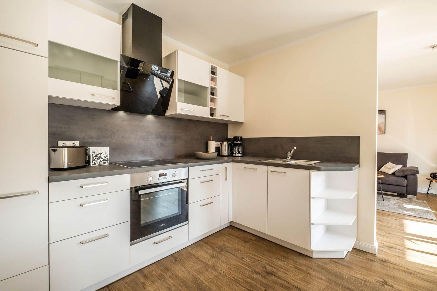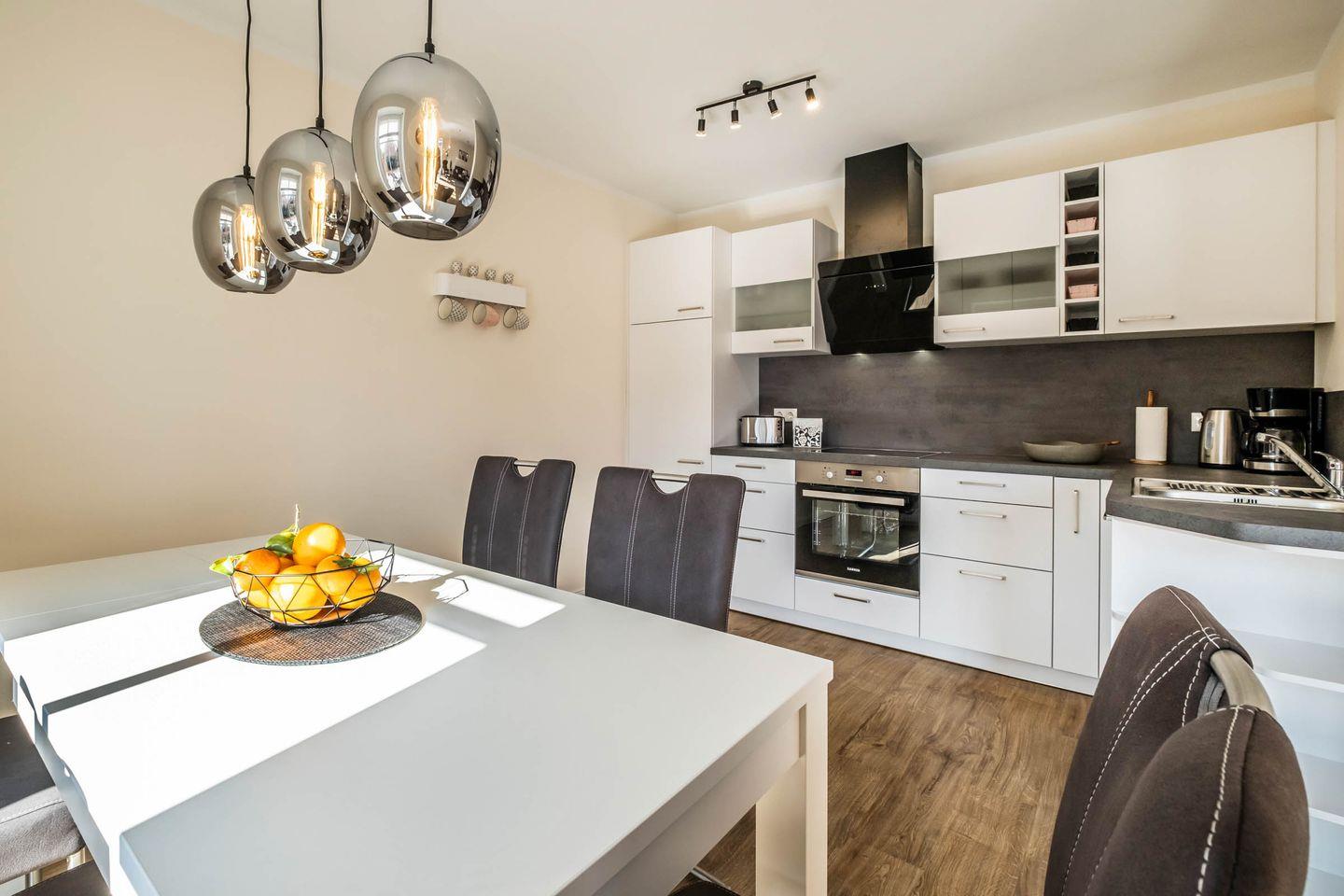 In der modernen Küche können Sie Ihre kulinarischen Fähigkeiten unter Beweis stellen oder einfach nur den guten alten Kaffee am Morgen genießen. Die voll ausgestattete Küche mit Ceran-Herd, Backofen, Mikrowelle und Spülmaschine lässt keine Wünsche offen. Hier finden Sie alles, was Sie benötigen – vom Kühlschrank mit Gefrierfach über eine Kaffeemaschine bis zu Geschirr und Besteck.