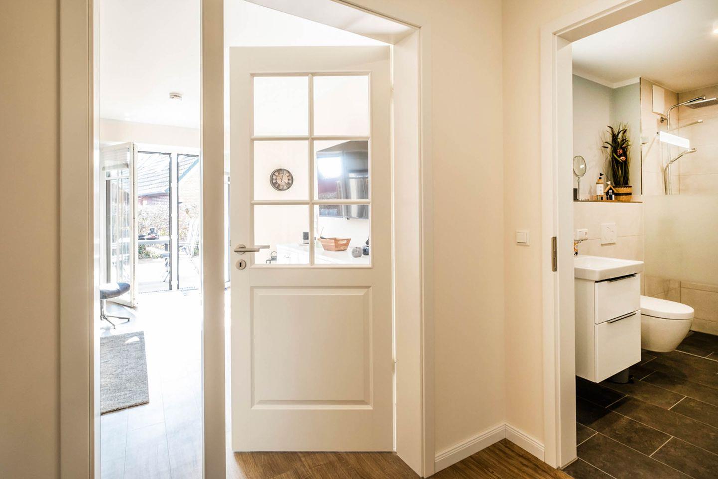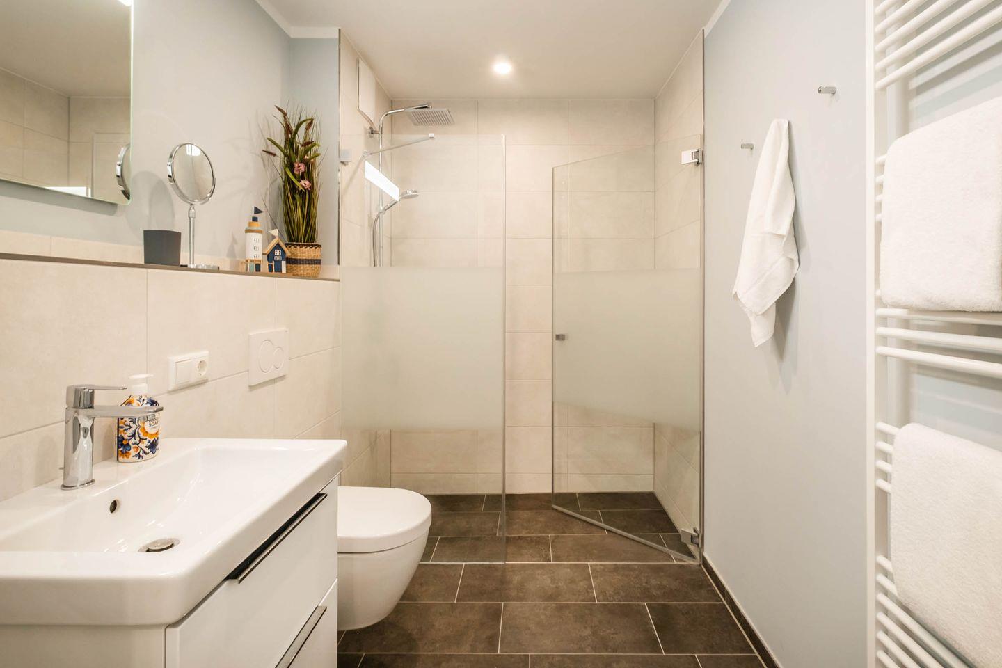Die Wohnung verfügt auch über ein stilvolles Badezimmer, das mit einer bodengleichen Dusche, einem Haartrockner und einem Kosmetikspiegel ausgestattet ist. Genießen Sie entspannte Momente in diesem ruhigen Raum, der für Ihr Wohlbefinden gestaltet wurde.