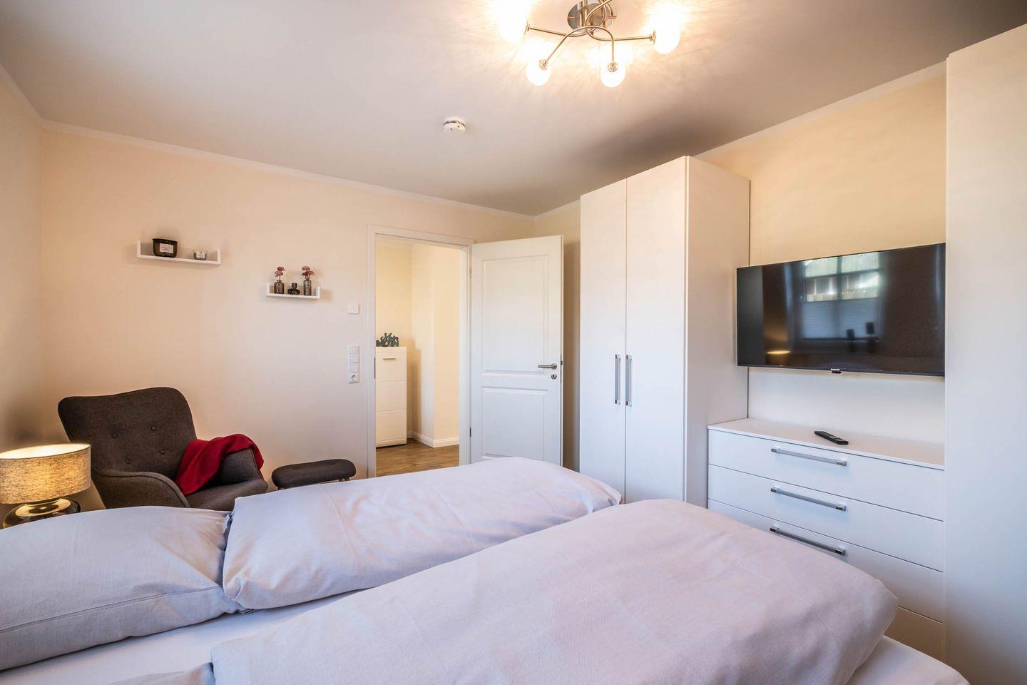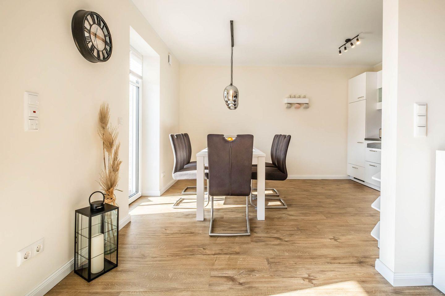 Betreten Sie die Wohnung und lassen Sie sich von der offenen, hellen Atmosphäre verzaubern. Der Wohnbereich ist mit einem bequemen Sofa, einem Sessel und einem Essbereich ausgestattet, wo Sie nach einem langen Tag am Strand oder bei Erkundungstouren in der Umgebung entspannen können. Für Ihre Unterhaltung stehen Ihnen zwei Fernseher zur Verfügung, sodass Sie sich auch im Urlaub nicht von Ihren Lieblingssendungen trennen müssen.