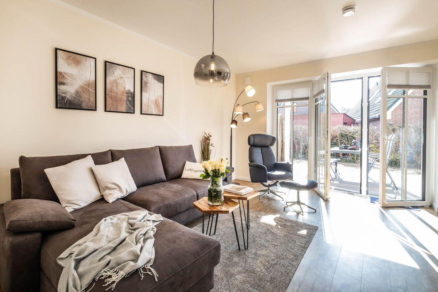 Ein besonderes Highlight dieser Ferienwohnung ist die großzügige Terrasse, die mit Gartenmöbeln ausgestattet ist. Hier können Sie die frische Nordseeluft genießen, ein gutes Buch lesen oder einfach nur die Seele baumeln lassen – der ideale Ort, um bei Sonnenuntergang die romantische Stimmung zu erleben.