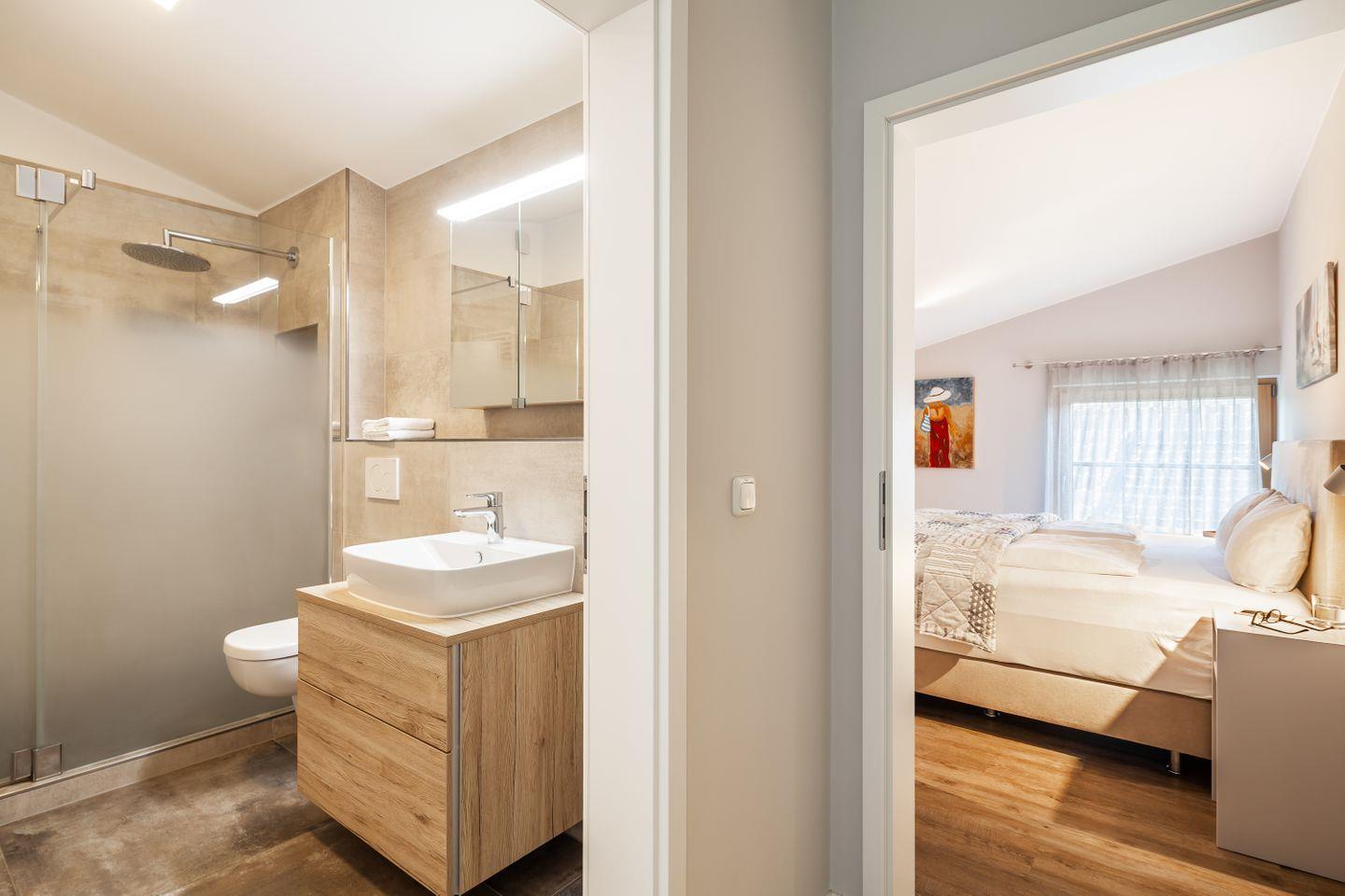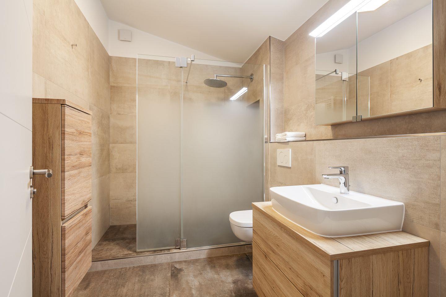Dusche, WC, Waschbecken, beleuchteter Spiegelschrank, Unterschrank Fön, Handtuchtrockner, Abluft