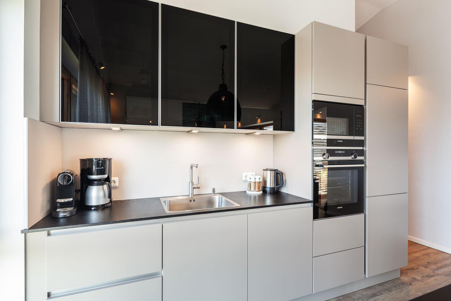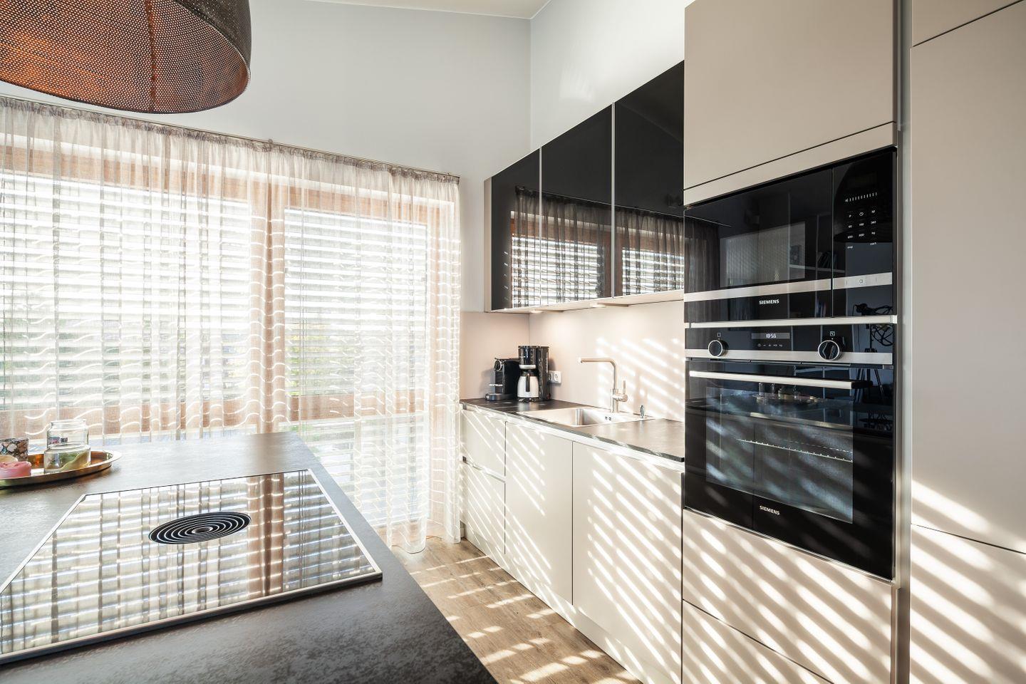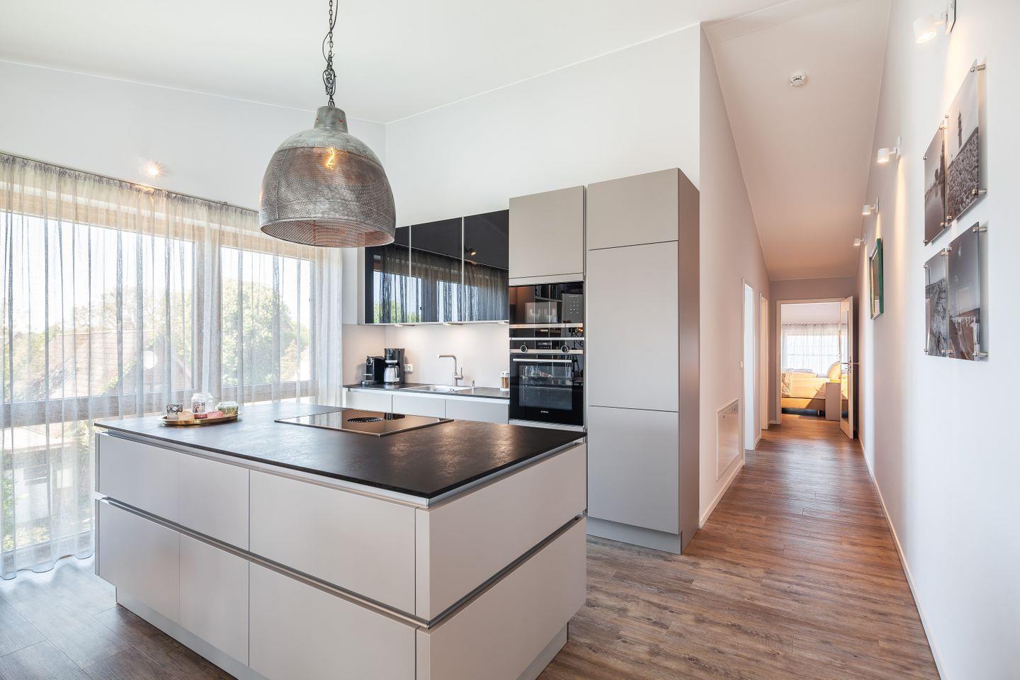 Kühlschrank mit Gefrierfach, Kochinsel mit Induktionsherd und Abluftanlage, Backofen, Kaffeemaschine, Espressomaschine, Wasserkocher, Toaster, Eierkocher
