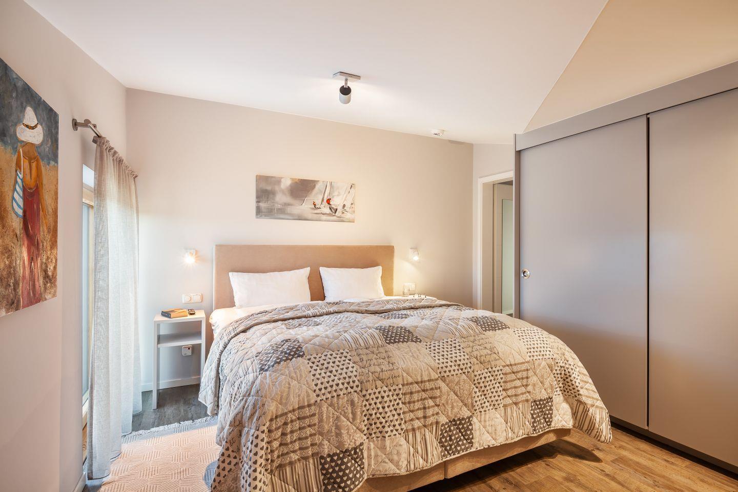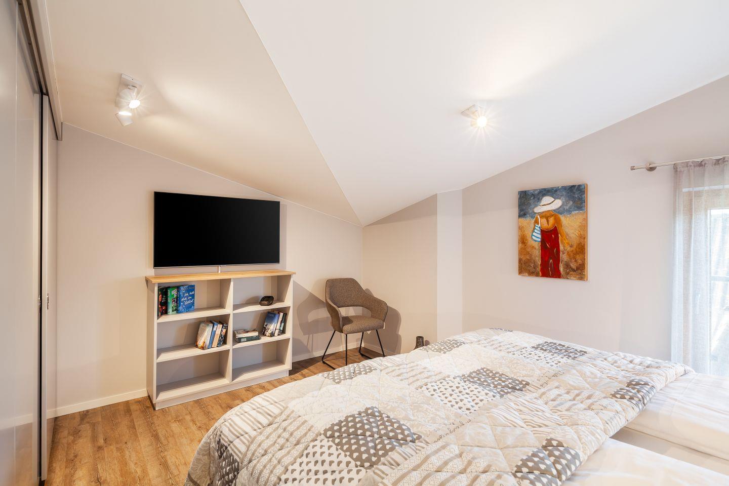 Boxspringdoppelbett (1,80x2,00m), Nachttische + Lampen, Flachbild-TV, beleuchteter Kleiderschrank, Fliegengitter, Außenjalousie