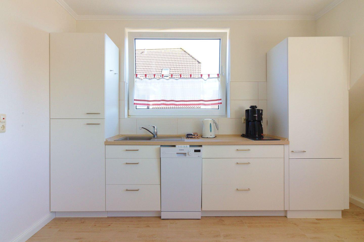 Küchenzeile: Geschirrspüler, Kochfeld, Kühlschrank, Heißwasserkocher, Kaffeemaschine, Toaster.