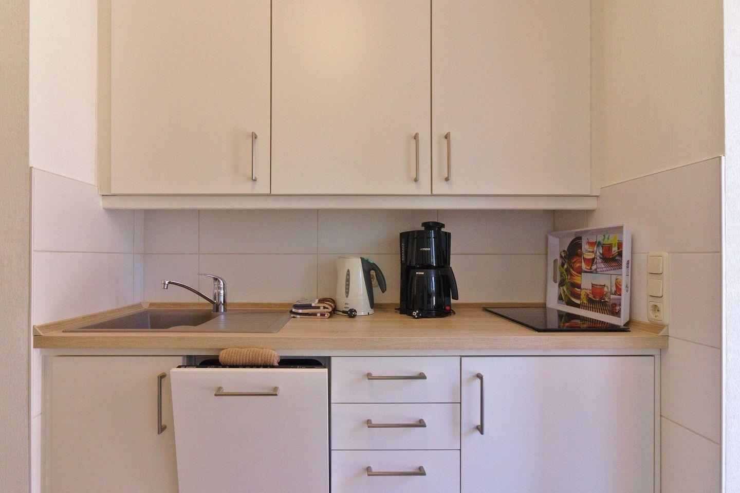 Küchenzeile: Geschirrspüler, Kochfeld, Kühlschrank, Heißwasserkocher, Kaffeemaschine, Toaster.