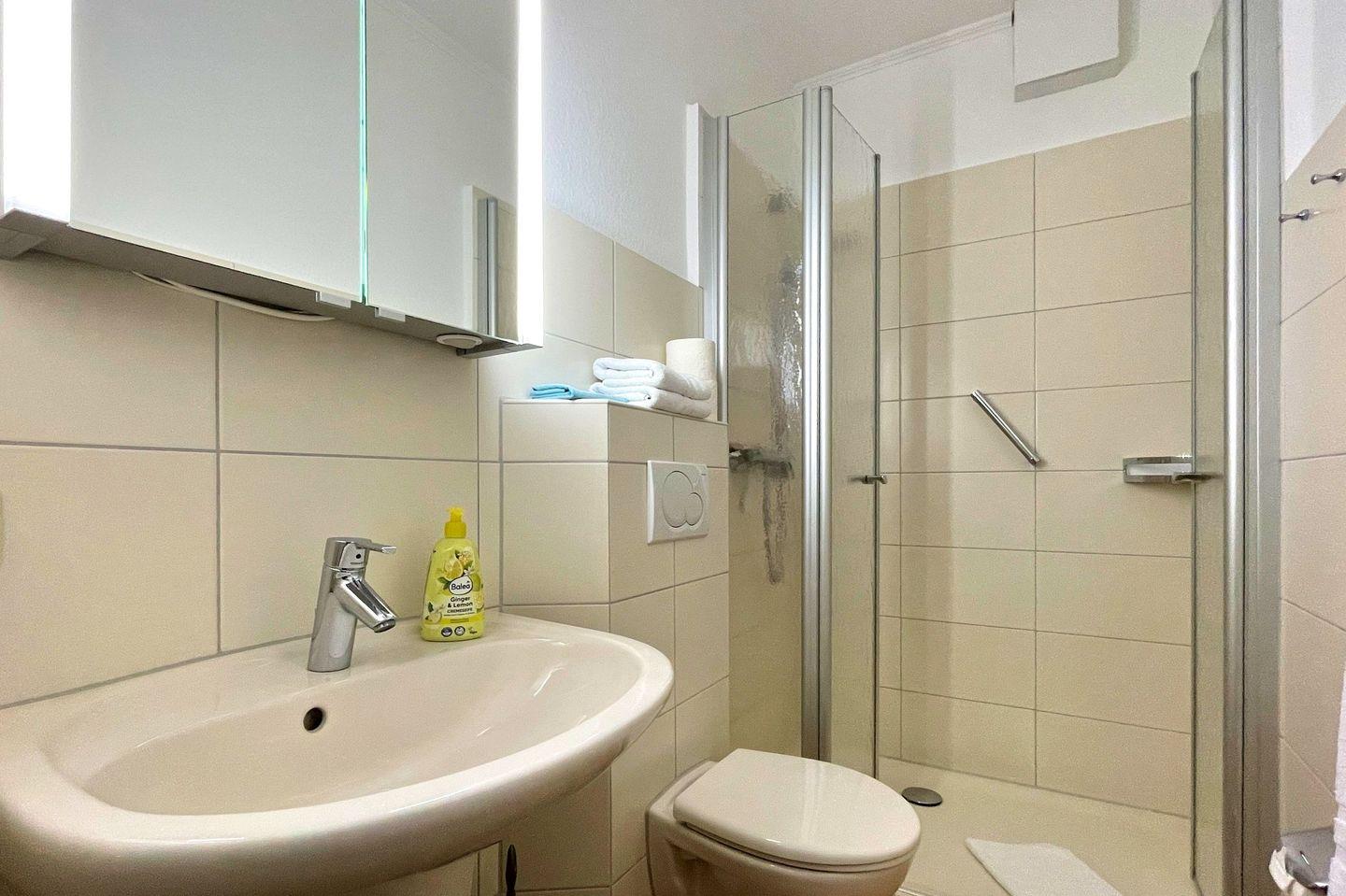 Das Bad verfügt über eine Dusche/WC. Vom Wohnbereich gelangen Sie auf die Süd-West Terrasse. Das Schlafzimmer verfügt über ein Doppelbett.