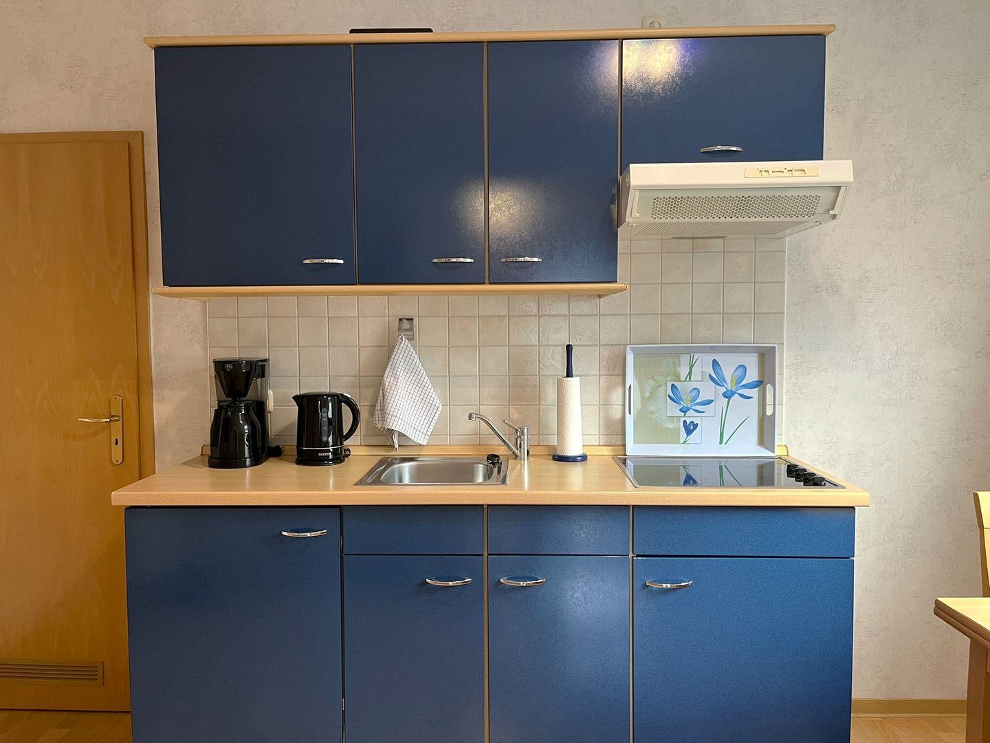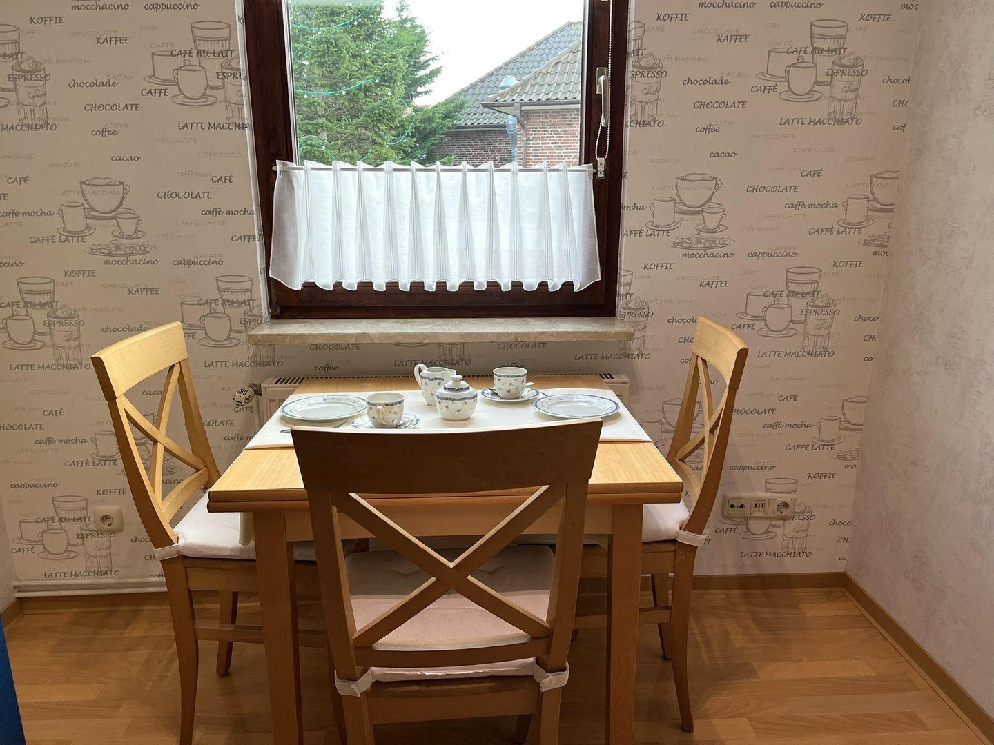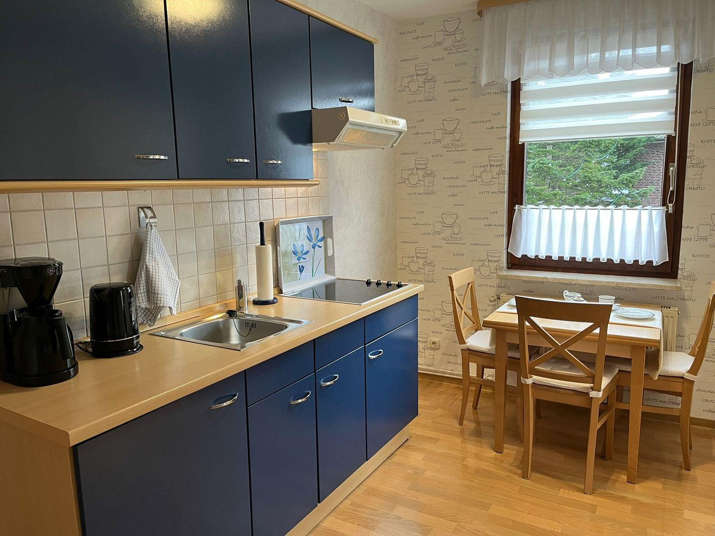 Die Ferienwohnung ist über eine etwas steilere Treppe, eines normalen Wohnhauses, zu erreichen und bietet ein helles und freundliches Wohnzimmer mit Laminatboden, das mit einem gemütlichen Sofa und einem Esstisch ausgestattet ist. Hier können Sie entspannte Abende verbringen oder einfach die Seele baumeln lassen. Angrenzend finden Sie die geschlossene Küche, die mit Cerankochfeld, Kühlschrank mit Gefrierfach, Kaffeemaschine, usw. ausgestattet ist. Eine Mikrowelle befindet sich im Vorflur zur Wohnung und kann gerne genutzt werden.