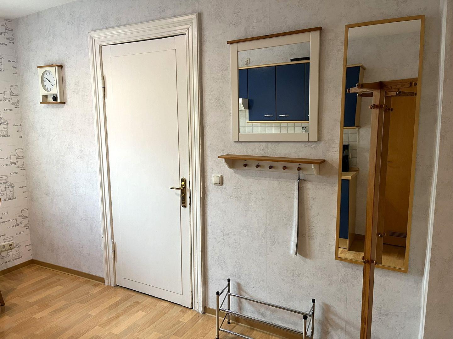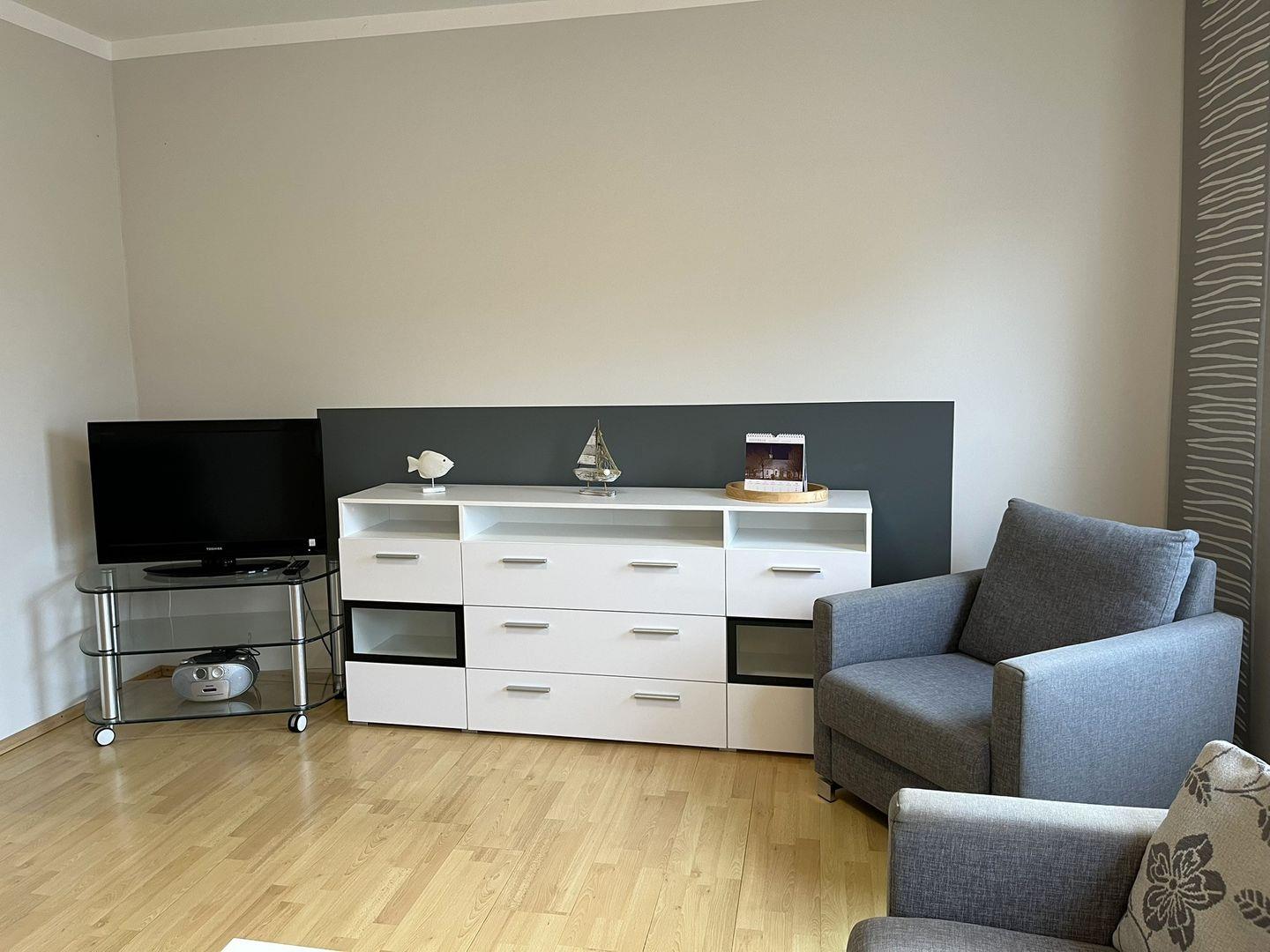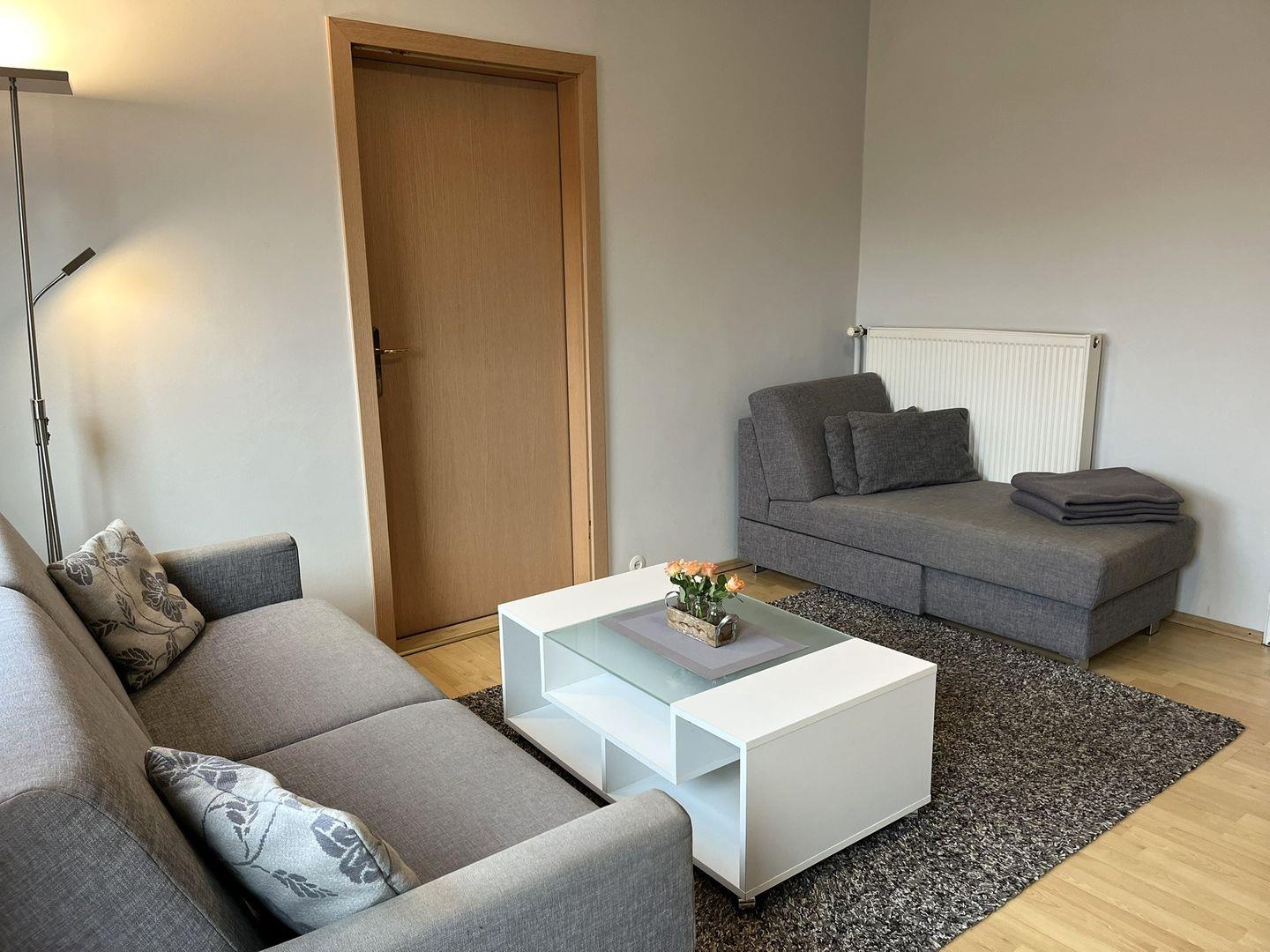 Die Ferienwohnung ist über eine etwas steilere Treppe, eines normalen Wohnhauses, zu erreichen und bietet ein helles und freundliches Wohnzimmer mit Laminatboden, das mit einem gemütlichen Sofa und einem Esstisch ausgestattet ist. Hier können Sie entspannte Abende verbringen oder einfach die Seele baumeln lassen. Angrenzend finden Sie die geschlossene Küche, die mit Cerankochfeld, Kühlschrank mit Gefrierfach, Kaffeemaschine, usw. ausgestattet ist. Eine Mikrowelle befindet sich im Vorflur zur Wohnung und kann gerne genutzt werden.