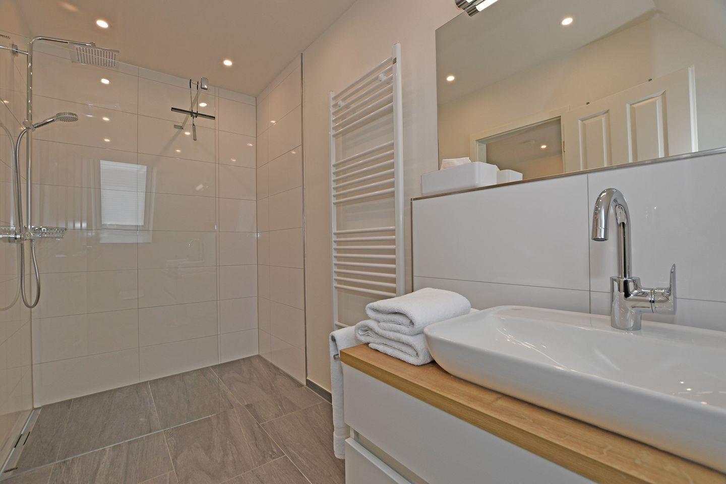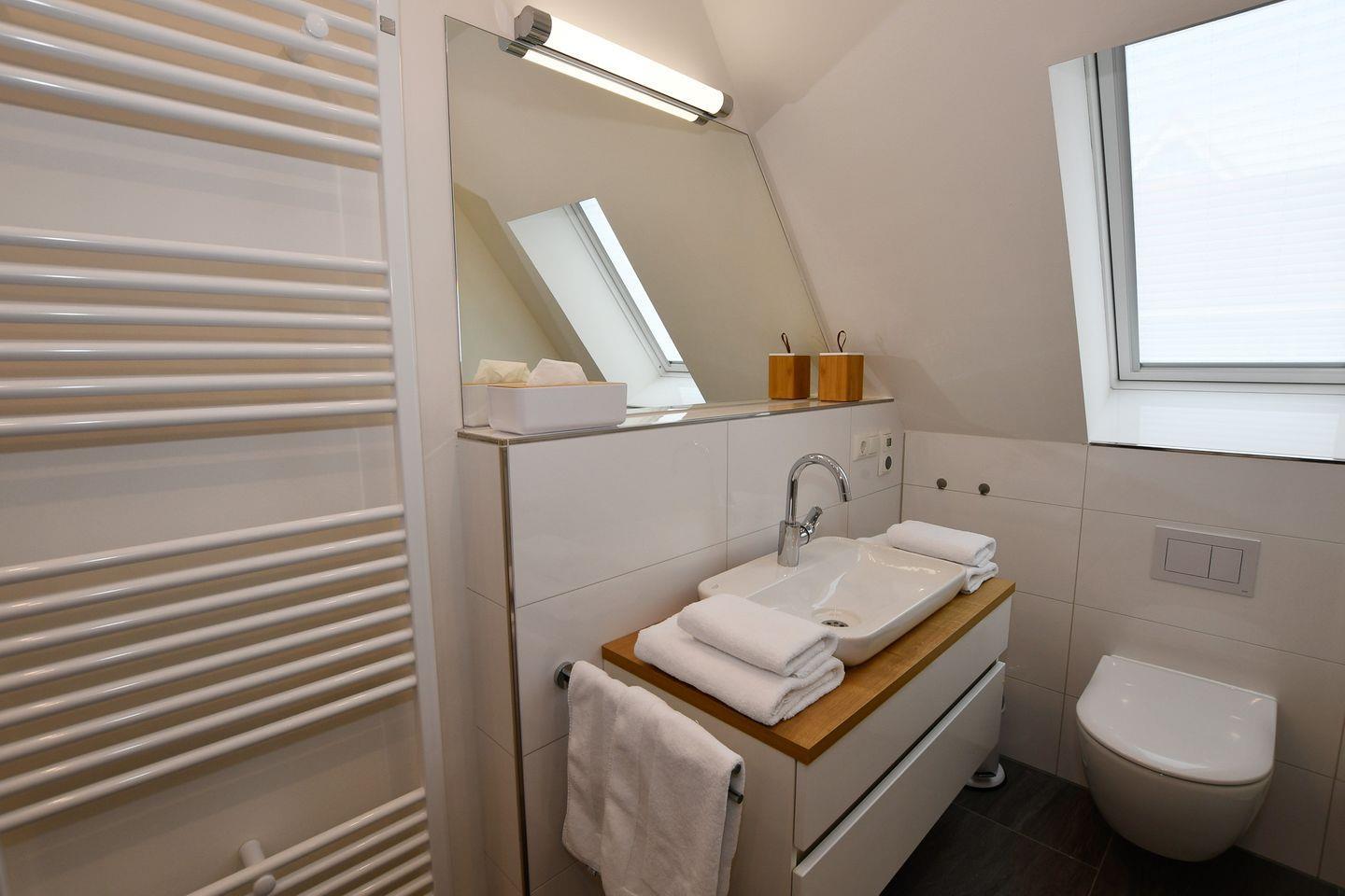 Das Badezimmer ist modern und praktisch ausgestattet mit einer bodengleichen Dusche, einem Waschbecken und einem WC. Für zusätzlichen Komfort sorgen ein Haartrockner sowie ein Kosmetikspiegel. Die gesamte Wohnung ist rauchfrei und mit Fußbodenheizung ausgestattet, sodass selbst kühle Tage angenehm warm sind.