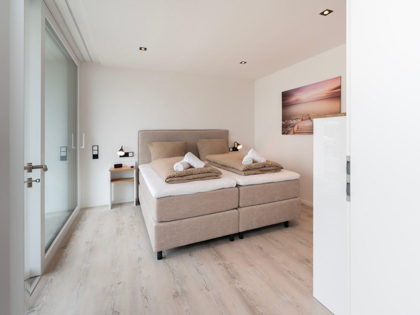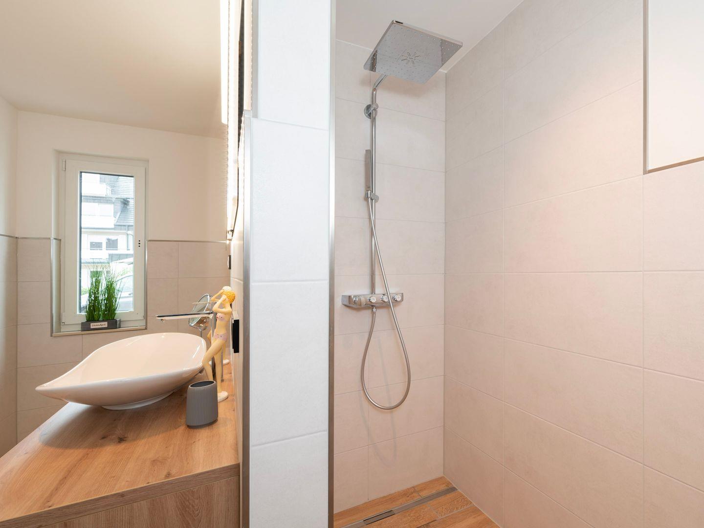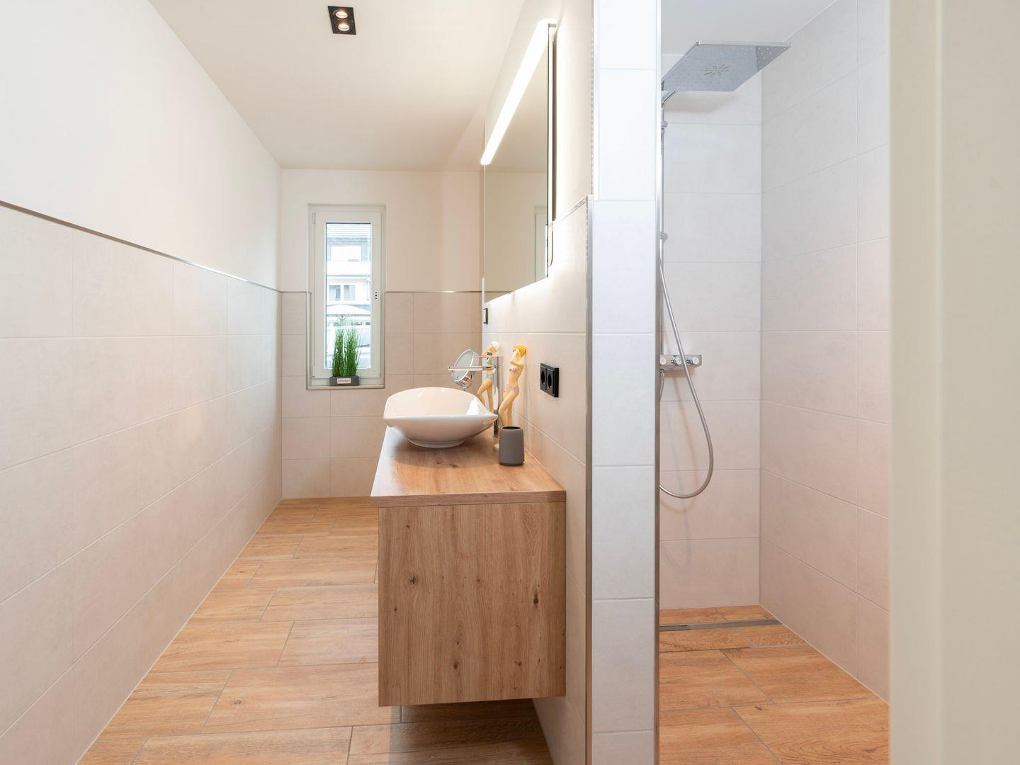 Ein weiteres Highlight der Wohnung ist das stilvolle Badezimmer mit bodengleicher Dusche, Waschbecken, WC und großen Fenstern, die für eine helle Atmosphäre sorgen. Die Fußbodenheizung und die Wärme der Einrichtung schaffen eine wohlige Atmosphäre, die zum Entspannen einlädt. Zusätzlich stehen Ihnen praktische Annehmlichkeiten wie eine Waschmaschine, ein Trockner und kostenfreies WLAN zur Verfügung.