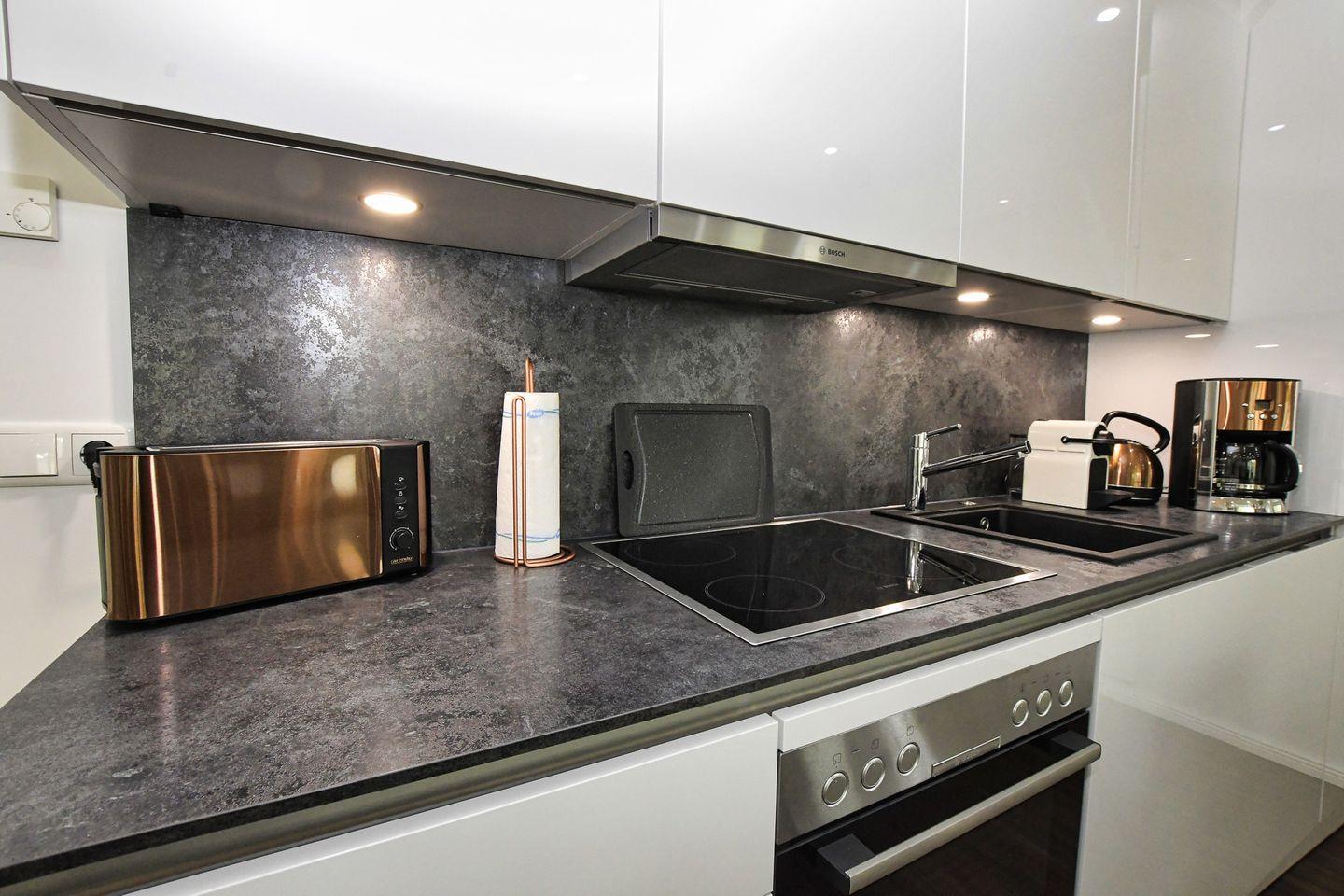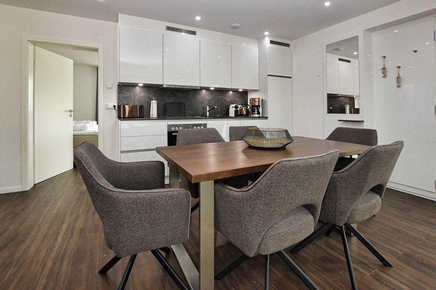 Die Wohnung befindet sich im Parterre und ist für Allergiker geeignet, sodass sich Menschen mit Allergien hier rundum wohlfühlen können. Die offene, lichtdurchflutete Küche ist ein Highlight. Sie ist mit allen modernen Annehmlichkeiten ausgestattet, darunter ein Ceranherd, Backofen, Mikrowelle, Spülmaschine, Kühlschrank mit Gefrierfach und zahlreiche Küchenutensilien. Ob ein schnelles Frühstück oder ein festliches Abendessen – hier gelingen Ihnen kulinarische Köstlichkeiten. Der angrenzende Essbereich lädt zu geselligen Mahlzeiten ein, während das Wohnzimmer mit einer bequemen Sofaecke, Sesseln und einem großen TV zu entspannten Abenden einlädt.