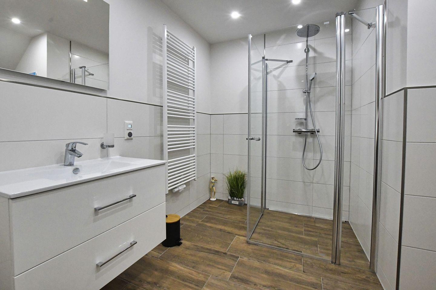 Die Wohnung verfügt über zwei gemütliche Schlafzimmer. Die Fußbodenheizung sorgt für angenehme Wärme an kühlen Tagen. Das moderne Badezimmer ist mit einer bodengleichen Dusche, einem WC und einem Waschbecken ausgestattet und bietet Ihnen jeden Komfort, den Sie benötigen. Außerdem stehen Ihnen Gemeinschaftswaschmaschinen und Trockner zur Verfügung.