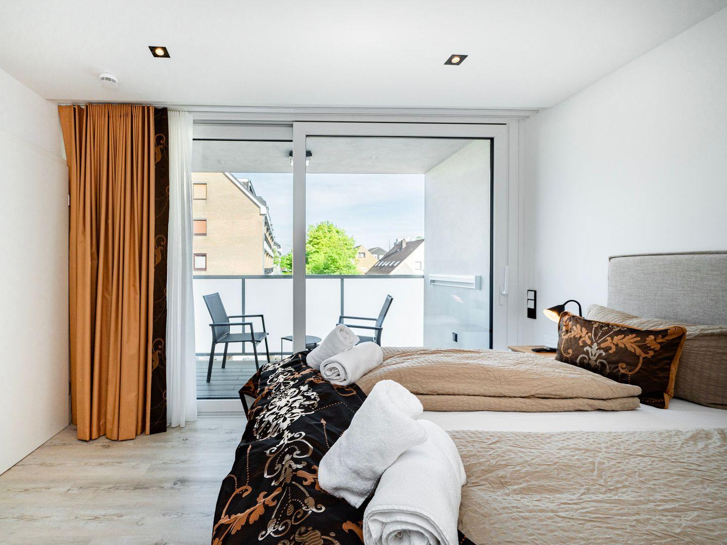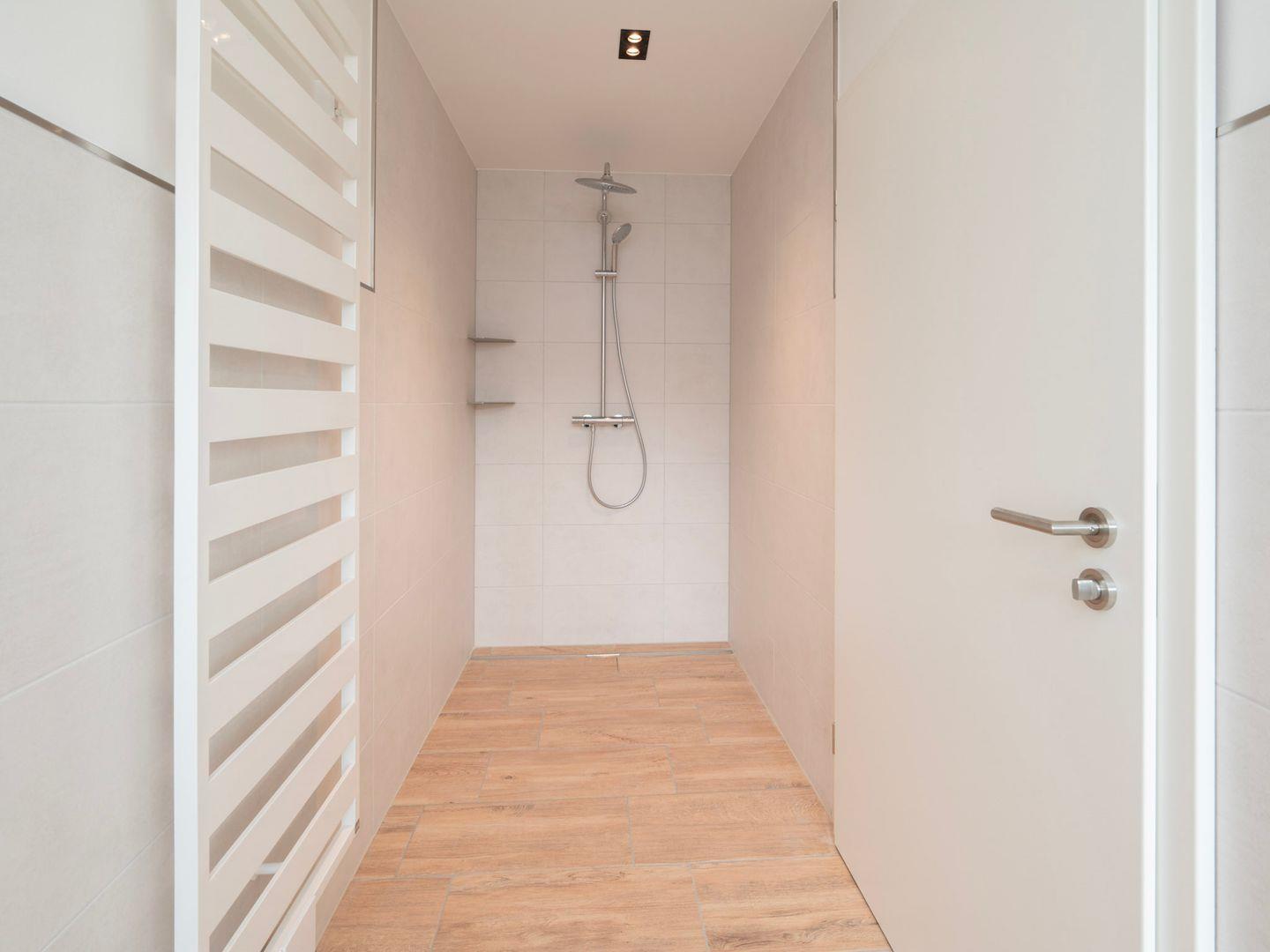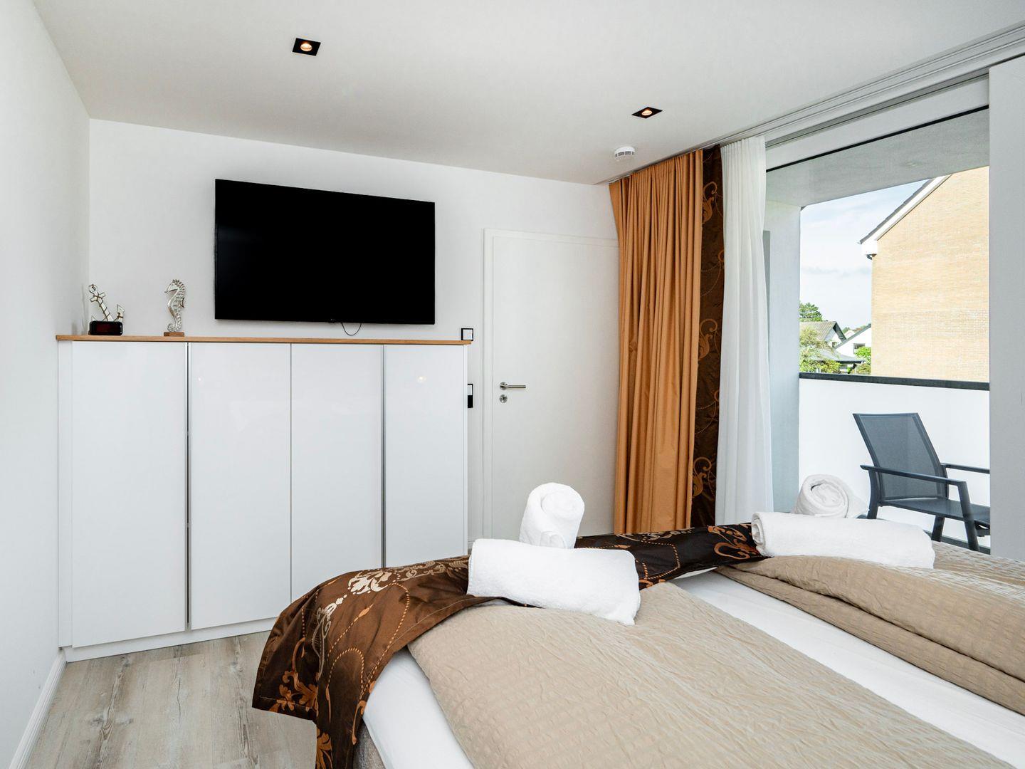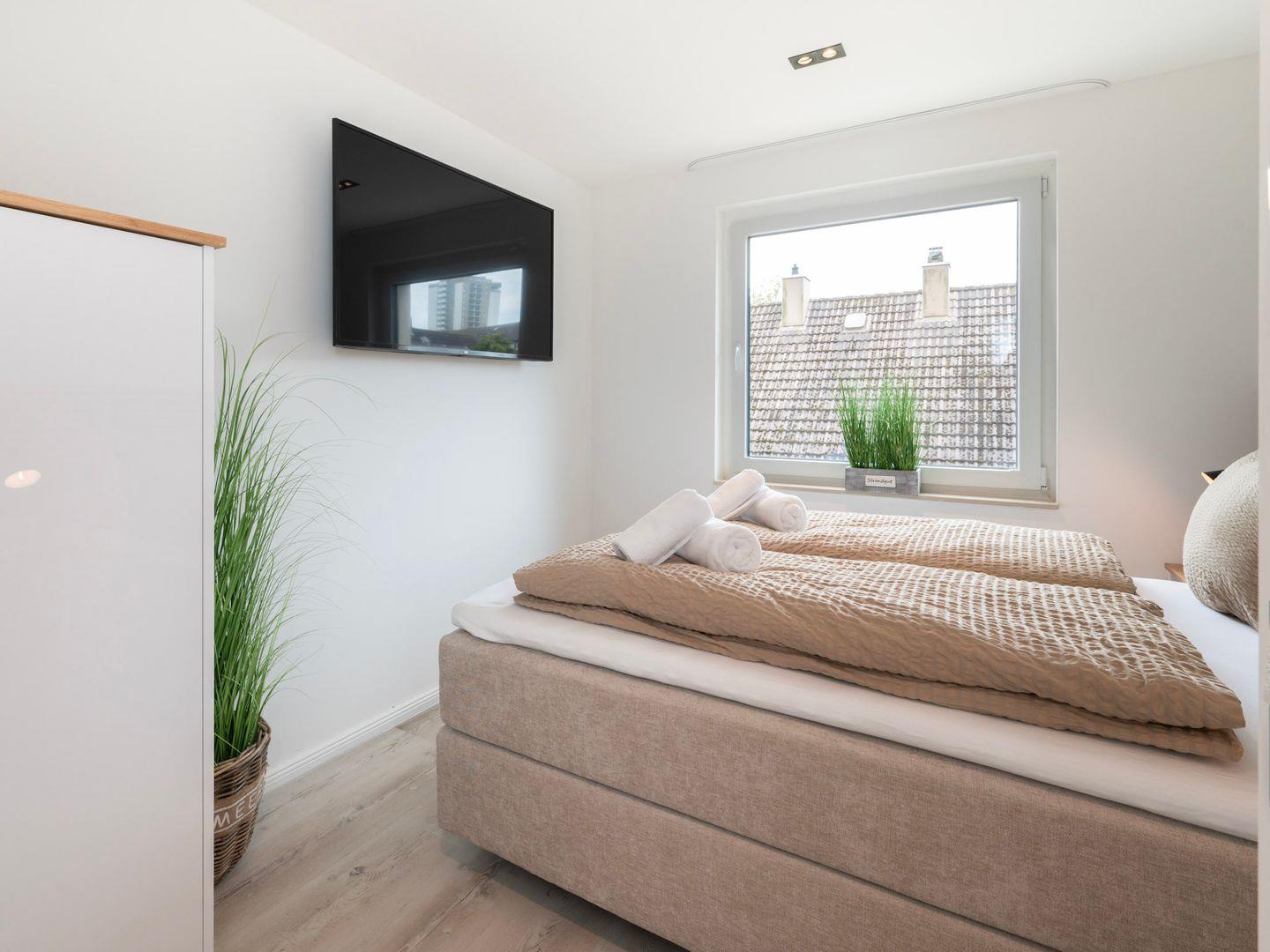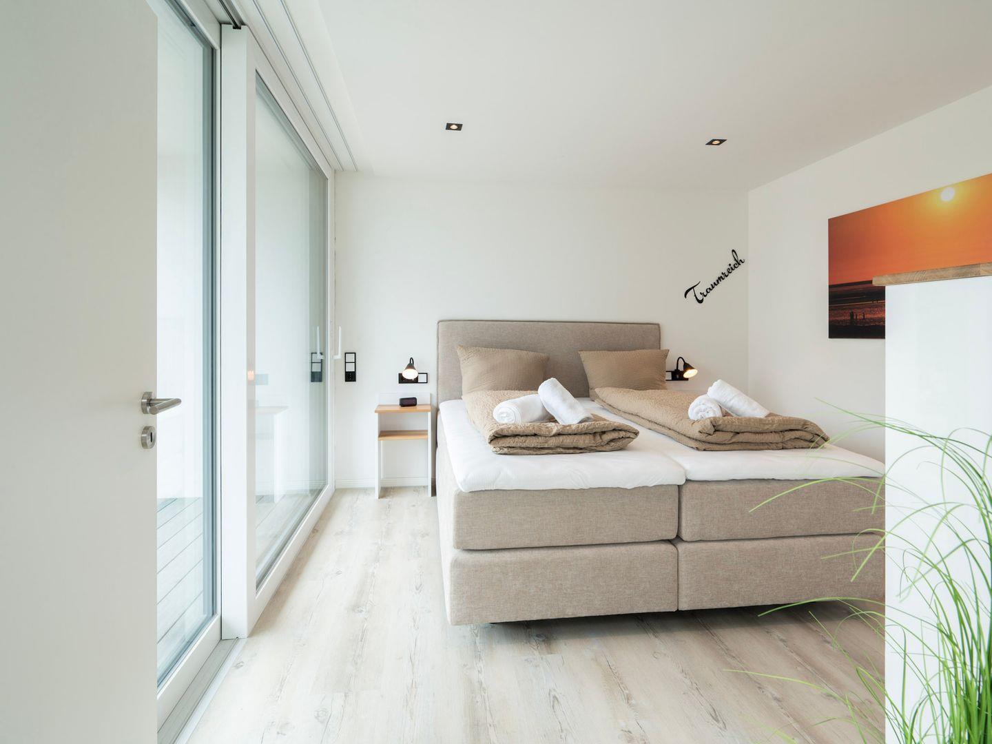 Zwei Schlafzimmer erwarten Sie, eines davon mit einem Doppelbett und das andere mit Schlafmöglichkeiten für bis zu vier Gäste. Die gemütlichen Betten garantieren Erholung und Entspannung nach einem aufregenden Tag an der Nordsee. Das Badezimmer besticht durch ein elegantes, bodengleiches Duschsystem und moderne Ausstattung, inklusive Kosmetikspiegel und Haartrockner.