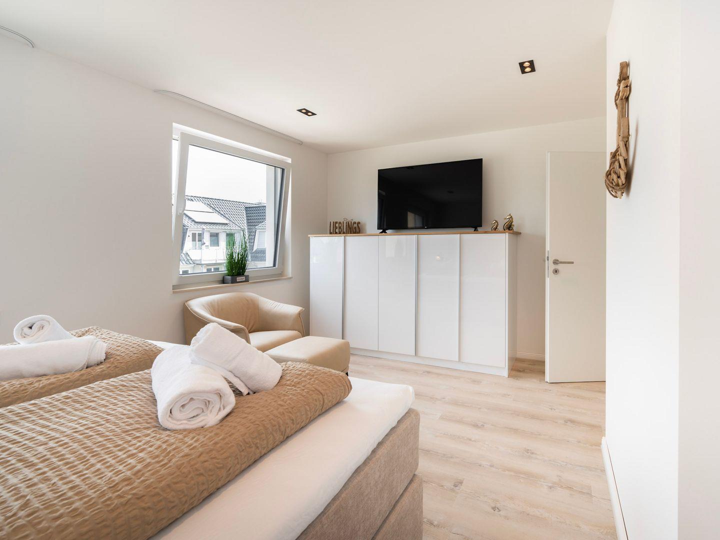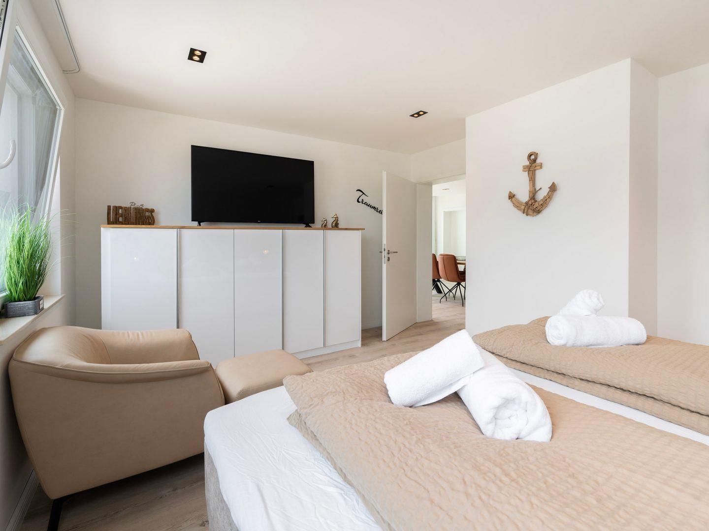 Die Wohnung, die 2023 renoviert wurde, liegt im ersten Stock eines gepflegten Hauses und ist bequem mit dem Aufzug zu erreichen. Sie verfügt über zwei einladende Schlafzimmer, die mit gemütlichen Betten ausgestattet sind und zum Träumen einladen. Der offene Wohnbereich, der mit einer Fußbodenheizung ausgestattet ist, sorgt für ein angenehmes Raumklima und bietet eine helle, freundliche Atmosphäre. Gemütliche Sofas und eine Essgruppe laden zu geselligen Abenden ein. Drei TVs sorgen dafür, dass auch beim Wetterwechsel das Unterhaltungsprogramm nicht zu kurz kommt.