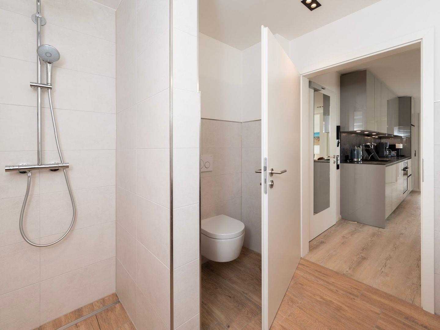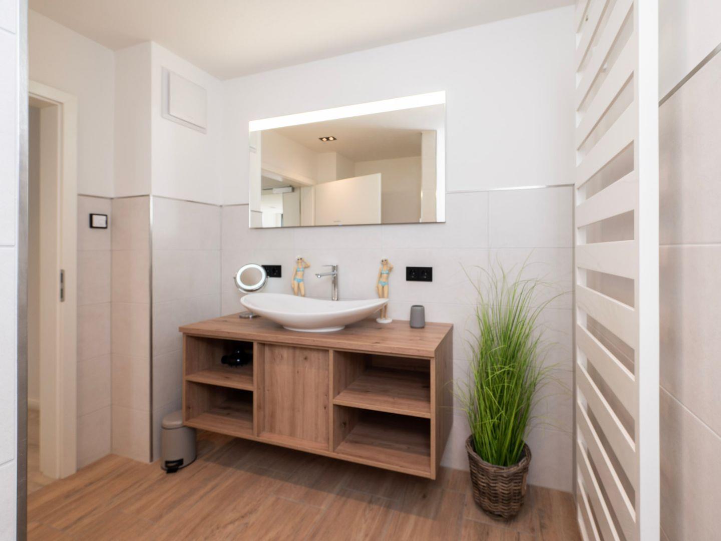 Entspannen Sie nach einem erlebnisreichen Tag in der bodengleichen Dusche im modernen Badezimmer, das mit einem Haartrockner und einem Kosmetikspiegel ausgestattet ist.