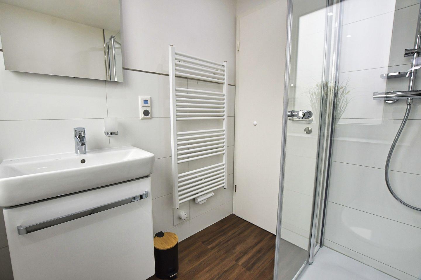 Das Badezimmer verfügt über eine bodengleiche Dusche, ein WC sowie ein Waschbecken. Es ist modern gestaltet und bietet alle notwendigen Utensilien, um Ihren Aufenthalt so angenehm wie möglich zu gestalten. Eine Waschmaschine und ein Trockner stehen zur gemeinsamen Nutzung zur Verfügung, damit Sie auch während Ihres Urlaubs für frische Wäsche sorgen können.