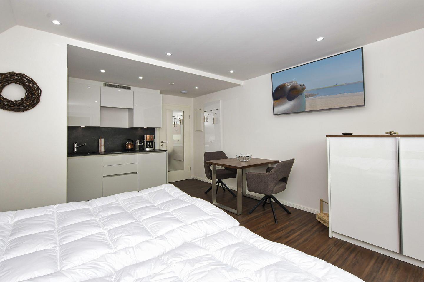 Willkommen in der "Inselzeit Wohnung 4" – Ihrem perfekten Rückzugsort in Büsum, wo der Komfort auf moderne Eleganz trifft! Diese charmante Ferienwohnung ist stilvoll eingerichtet und bietet auf 28 m² Platz für bis zu zwei Personen. Ob Sie einen romantischen Kurzurlaub zu zweit planen oder einfach eine ruhige Auszeit vom Alltag suchen, hier sind Sie genau richtig.