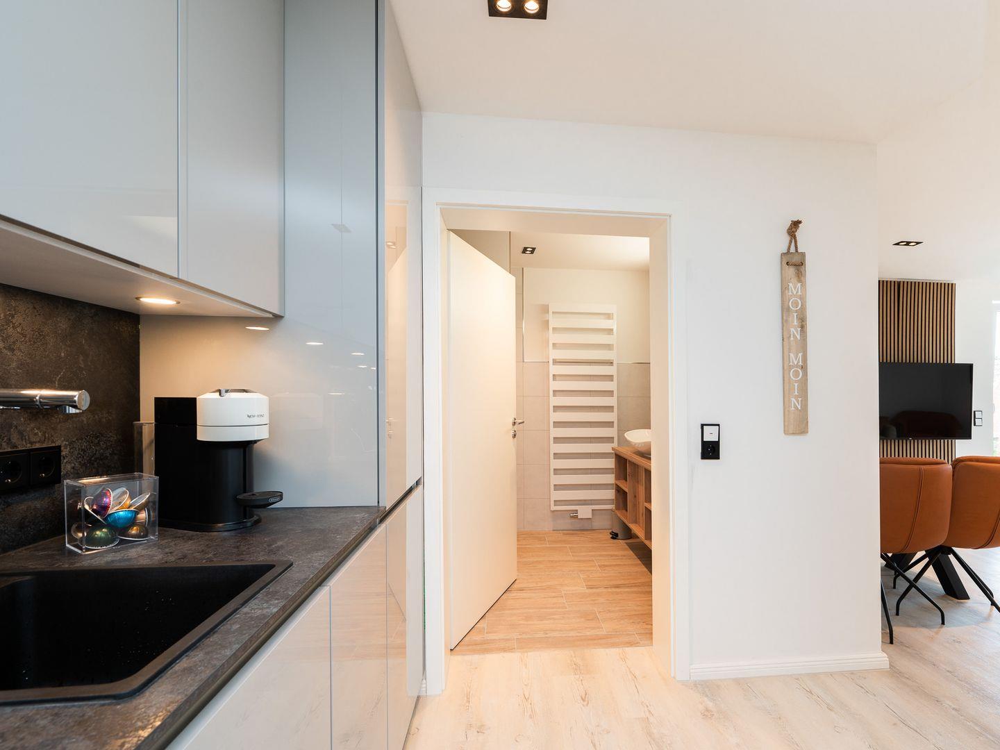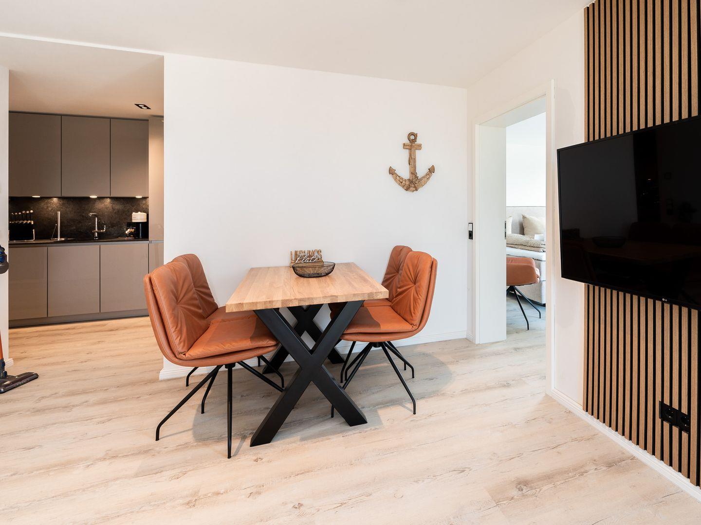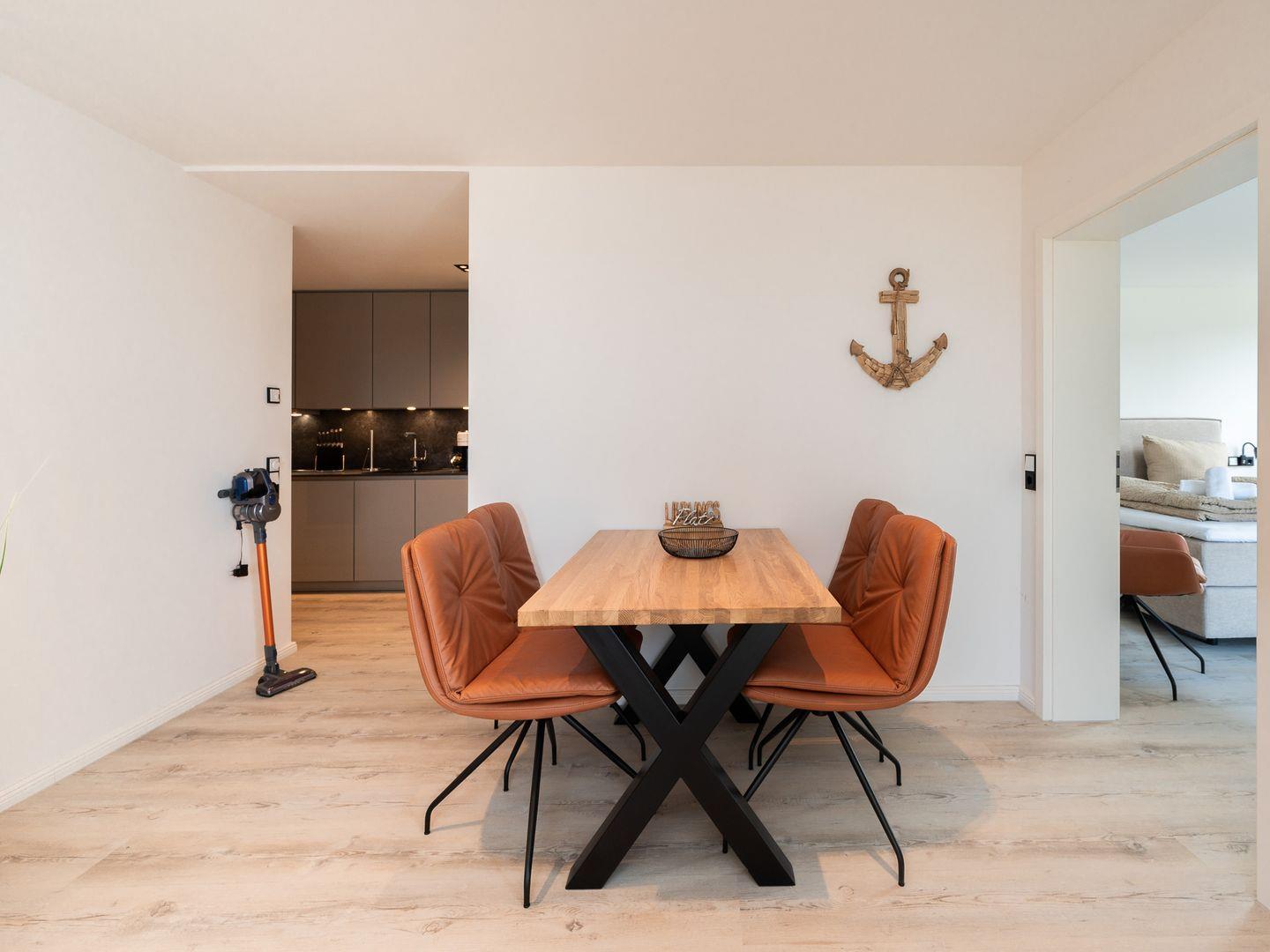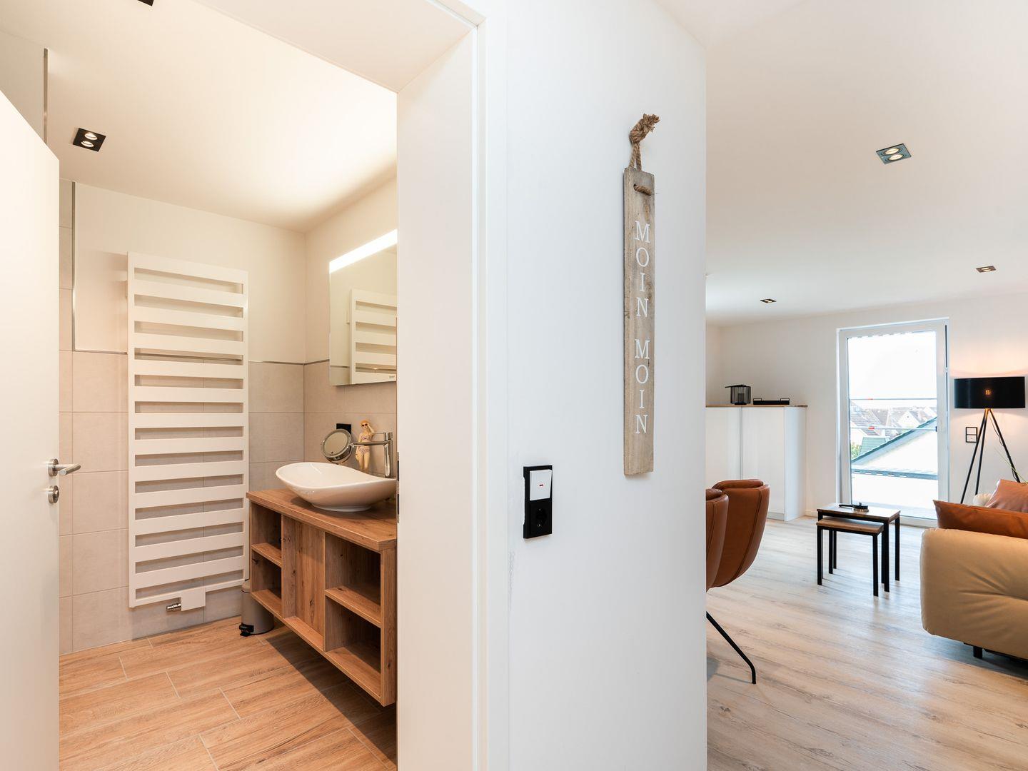 Ein besonderes Highlight der Inseltörn Wohnung ist der Balkon, der Ihnen die Möglichkeit gibt, frische Luft zu schnappen und die Ruhe der Umgebung zu genießen – der perfekte Ort, um den Tag bei einem Kaffee oder einem Glas Wein ausklingen zu lassen. Das Badezimmer ist modern und mit einer bodengleichen Dusche, einem Waschbecken, WC sowie einem Kosmetikspiegel ausgestattet, so dass Sie alles finden, was Sie für Ihren Aufenthalt benötigen. Für zusätzlichen Komfort sorgt die Fußbodenheizung, die in der ganzen Wohnung für ein behagliches Ambiente sorgt.