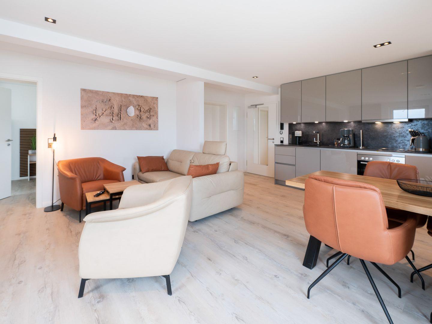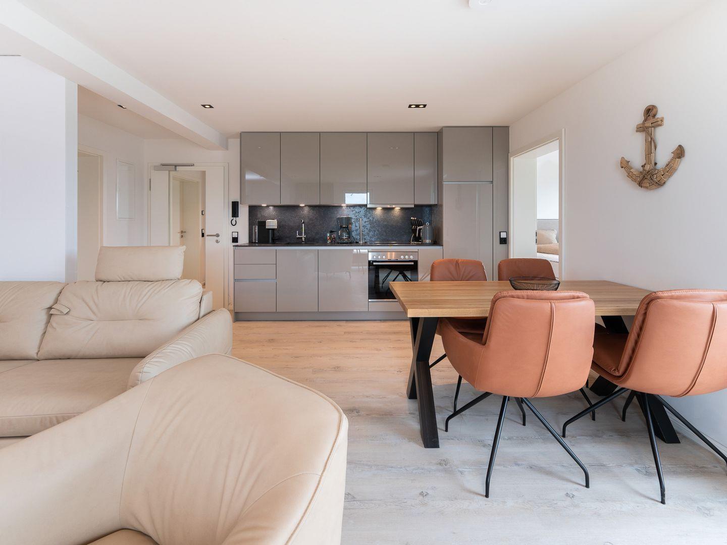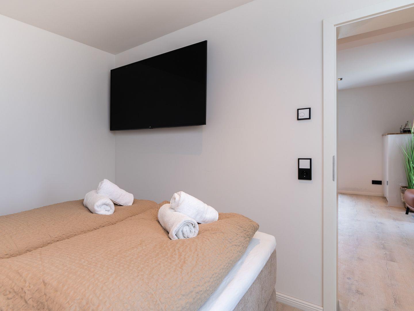 Die Wohnung verfügt über ein gemütliches Schlafzimmer sowie eine offene Wohnküche, die nahtlos in den einladenden Wohnbereich übergeht. Hier können Sie entspannte Abende auf dem komfortablen Sofa verbringen oder einen der drei Fernseher nutzen, um sich nach einem Tag am Strand zu entspannen. Das geschmackvolle Interieur wird durch Fußbodenheizung ergänzt, die für zusätzlichen Komfort sorgt, besonders in den kühleren Monaten.
