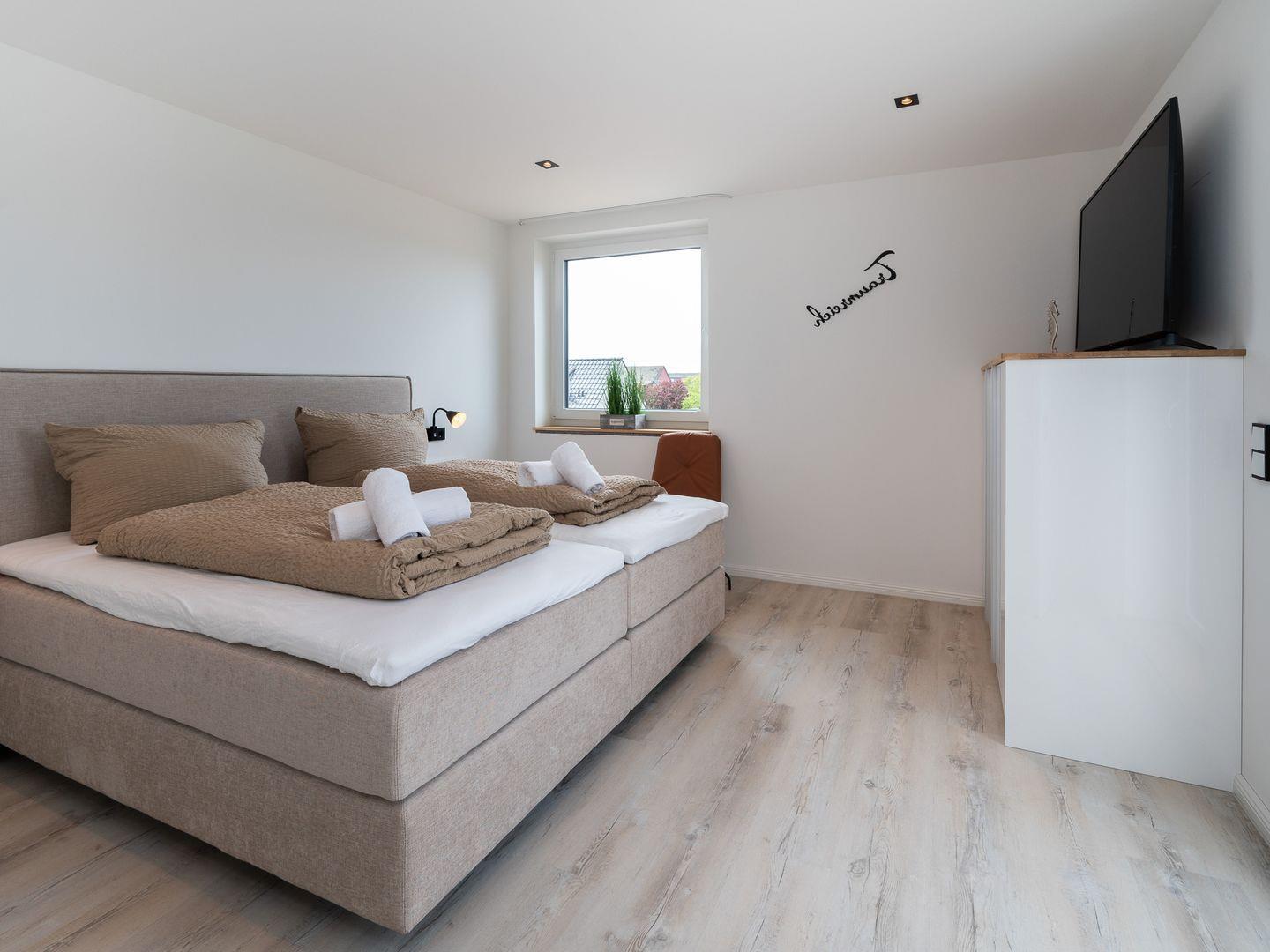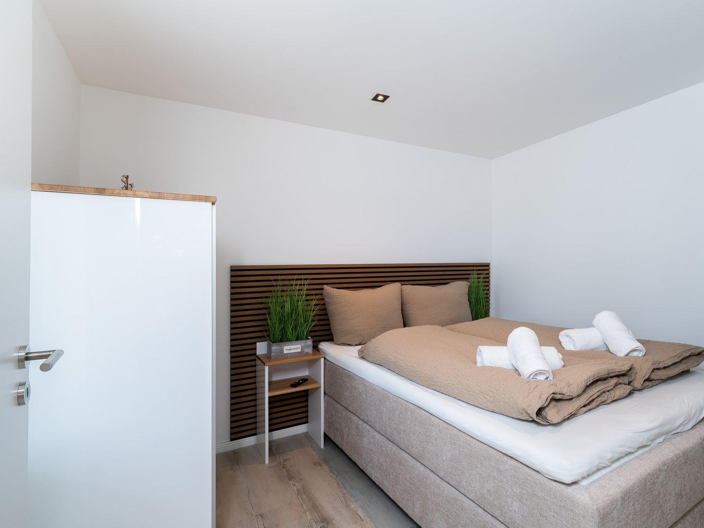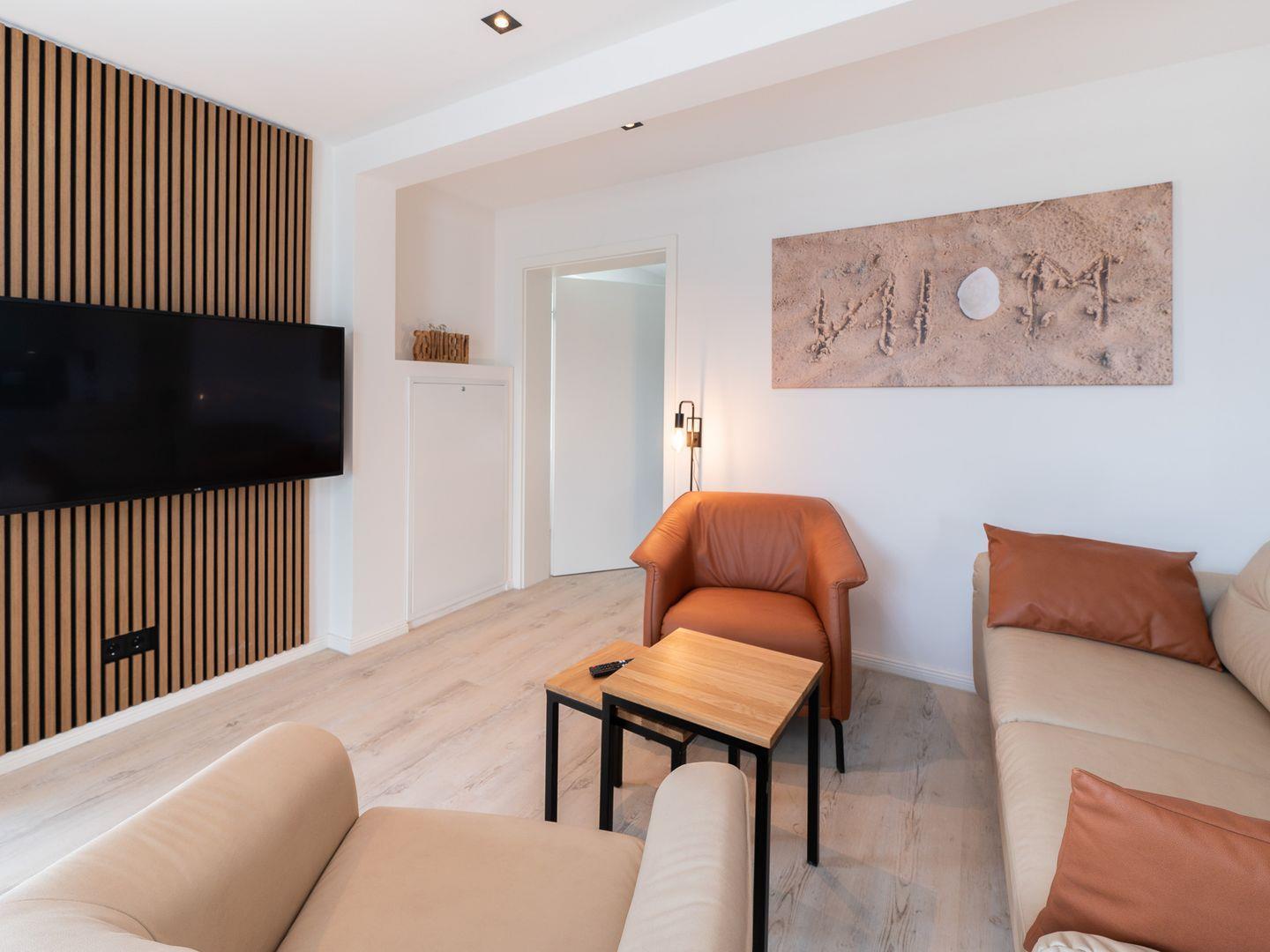 Die Wohnung verfügt über ein gemütliches Schlafzimmer sowie eine offene Wohnküche, die nahtlos in den einladenden Wohnbereich übergeht. Hier können Sie entspannte Abende auf dem komfortablen Sofa verbringen oder einen der drei Fernseher nutzen, um sich nach einem Tag am Strand zu entspannen. Das geschmackvolle Interieur wird durch Fußbodenheizung ergänzt, die für zusätzlichen Komfort sorgt, besonders in den kühleren Monaten.