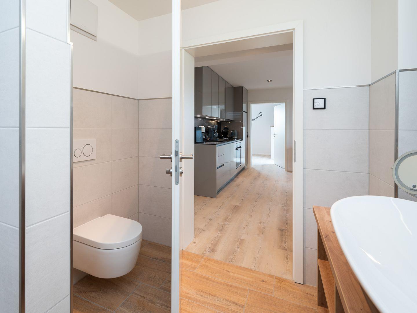 Das Badezimmer ist mit einer bodengleichen Dusche ausgestattet, die den Charakter der Wohnung unterstreicht. Hier finden Sie auch einen Haartrockner sowie einen Kosmetikspiegel – ideal für Ihre morgendliche Routine. Für zusätzlichen Komfort sorgt die hochwertige Ausstattung, die auch Allergiker geeignet ist.