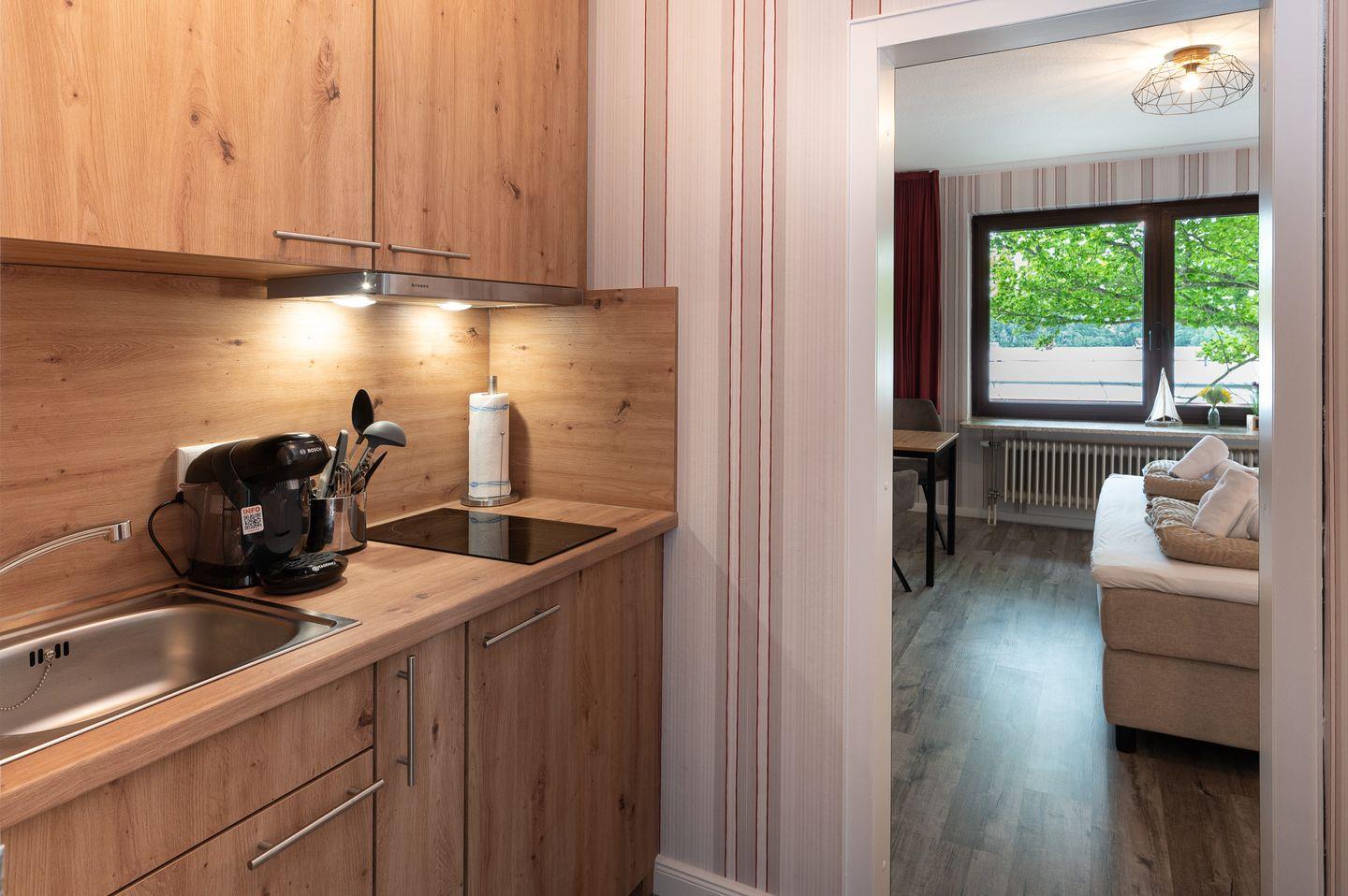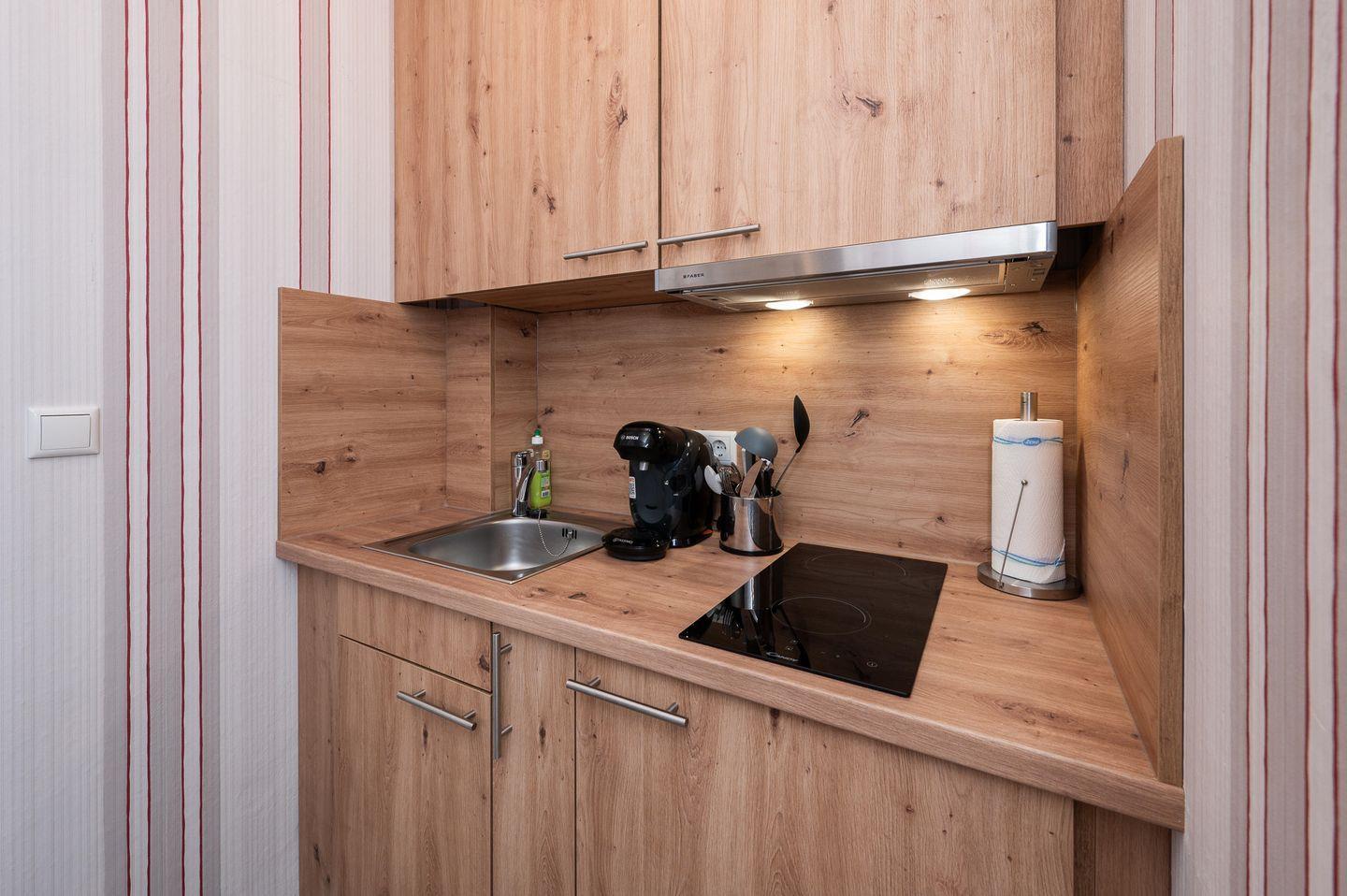 Die kleine, aber gut ausgestattete Kochnische lässt keine Wünsche offen. Sie finden hier einen Kühlschrank, eine Espressomaschine (Tassimo) und alle notwendigen Küchenutensilien, um Ihre Lieblingsgerichte zuzubereiten. Der Essbereich lädt dazu ein, nach einem aufregenden Tag die Erlebnisse bei einem gemütlichen Abendessen Revue passieren zu lassen.