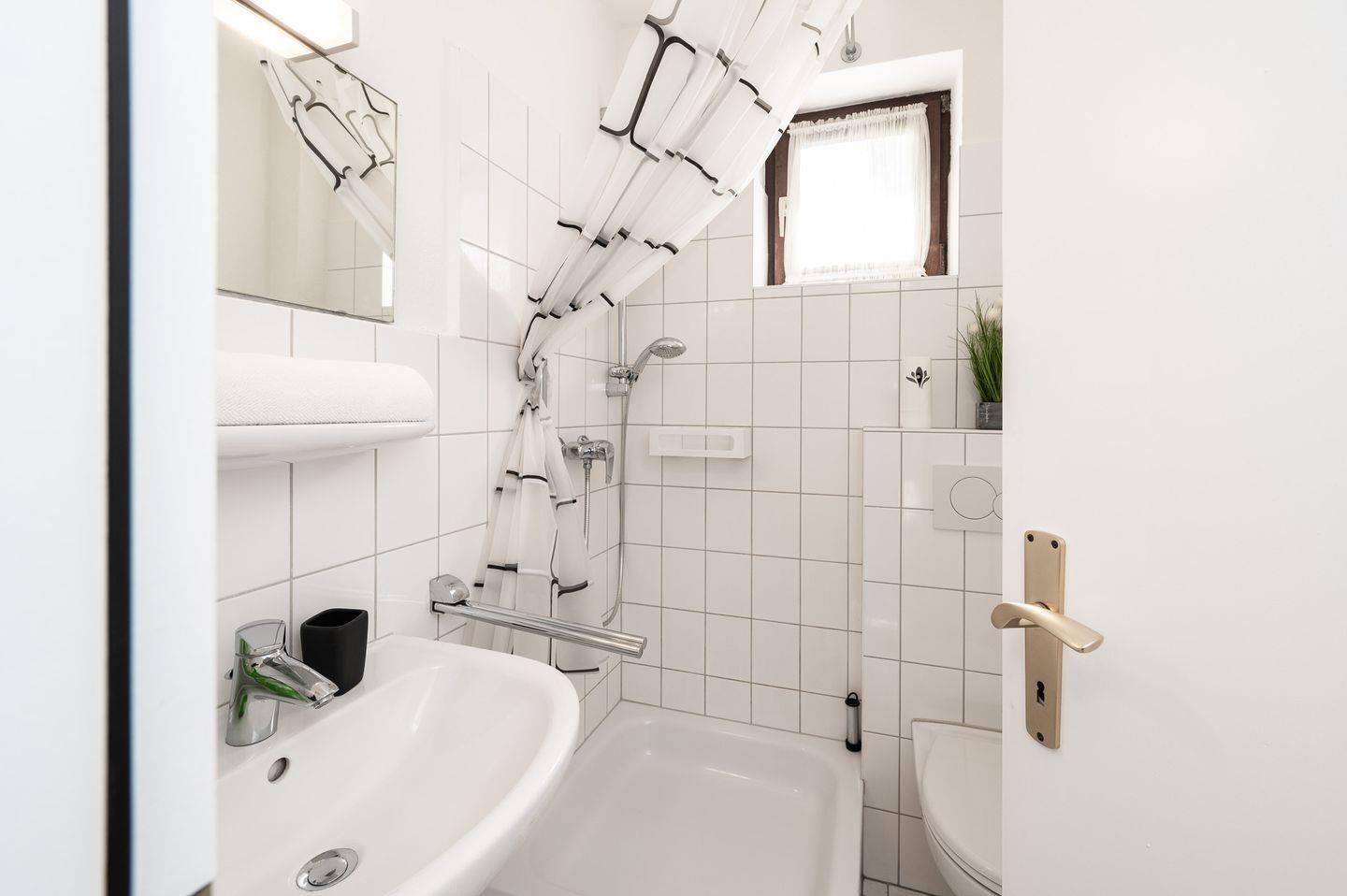Das Badezimmer ist modern ausgestattet und bietet alles für Ihr Wohlbefinden: eine Dusche, ein Waschbecken, ein WC sowie ein Haartrockner – ideal für einen erfrischenden Start in den Tag.