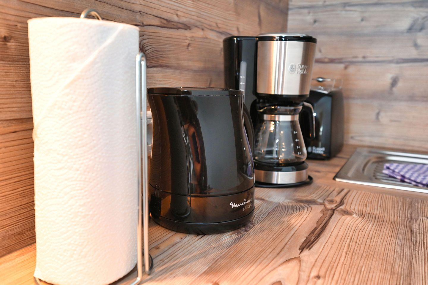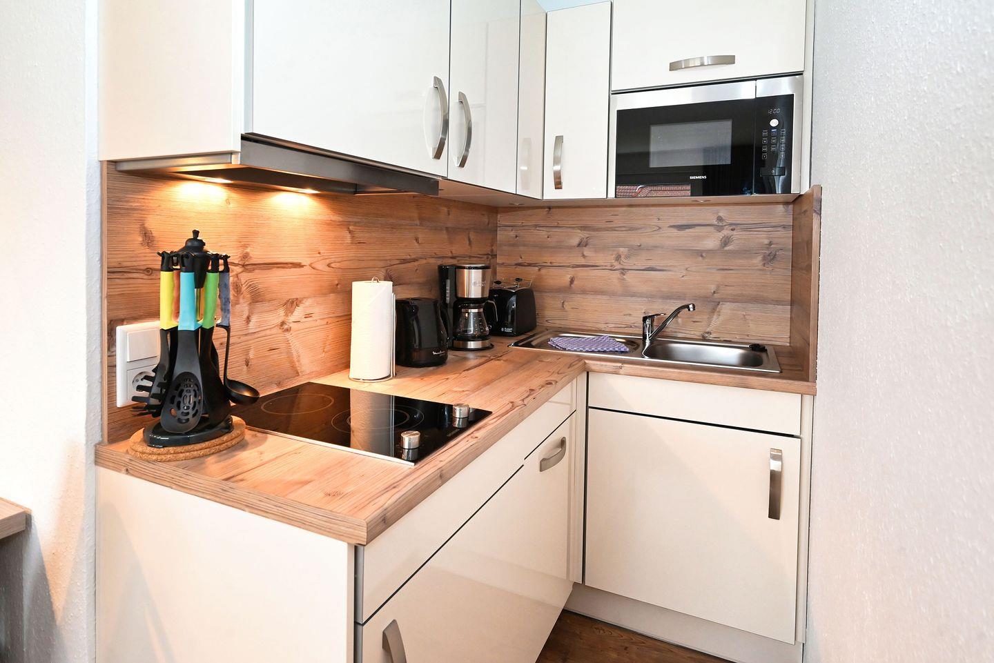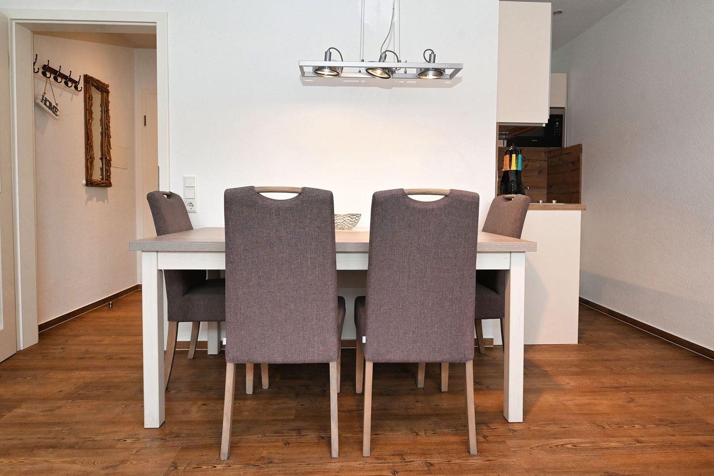 Die offene Küche, die zum Wohnbereich hin integriert ist, ist mit modernsten Annehmlichkeiten ausgestattet. Sie finden alles, was Sie für Ihre kulinarischen Erlebnisse benötigen, von einem Herd über eine Spülmaschine bis hin zu einem Kühlschrank mit Gefrierfach. Kaffeeliebhaber können sich über eine Kaffeemaschine freuen, um den perfekten Start in den Tag zu genießen. Der Esstisch bietet ausreichend Platz für gemeinsame Mahlzeiten und gesellige Abende.