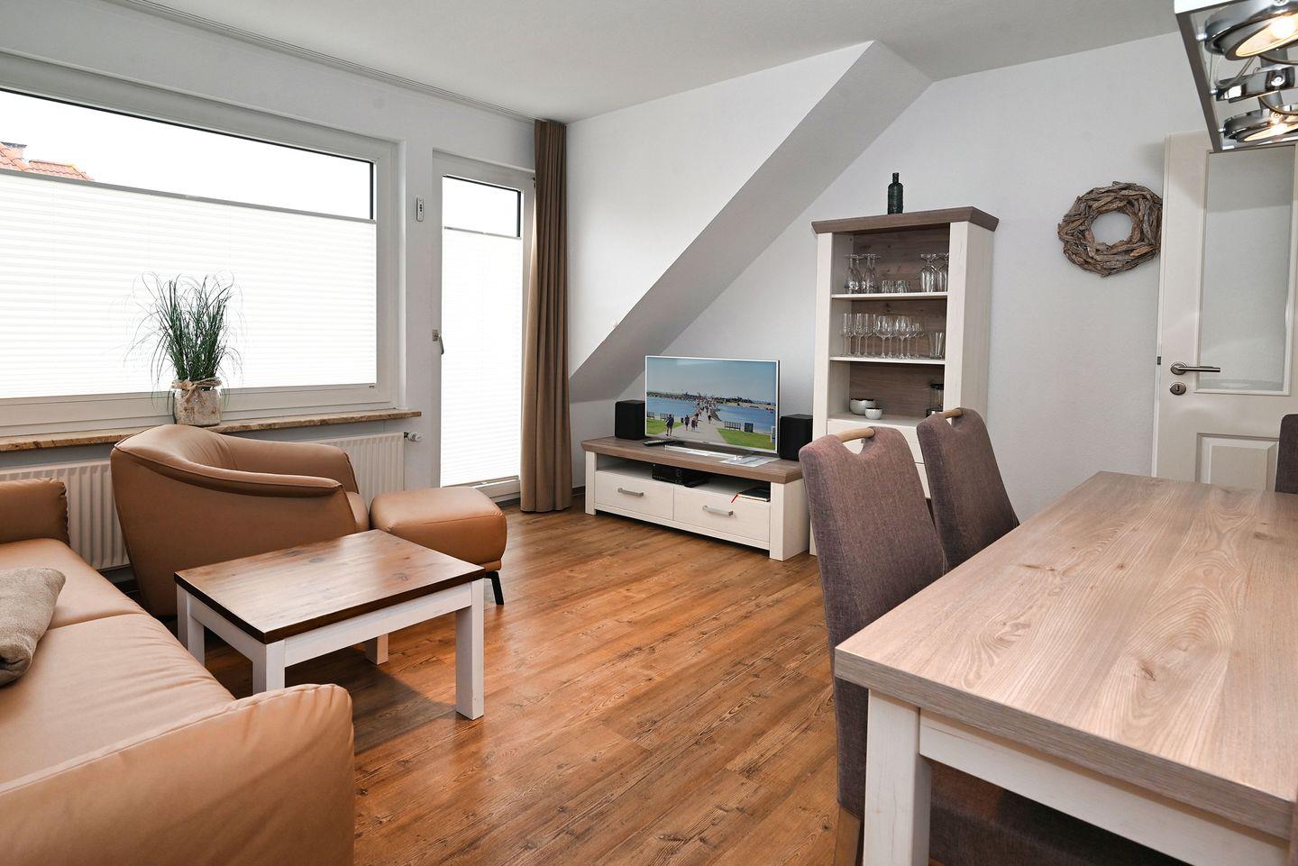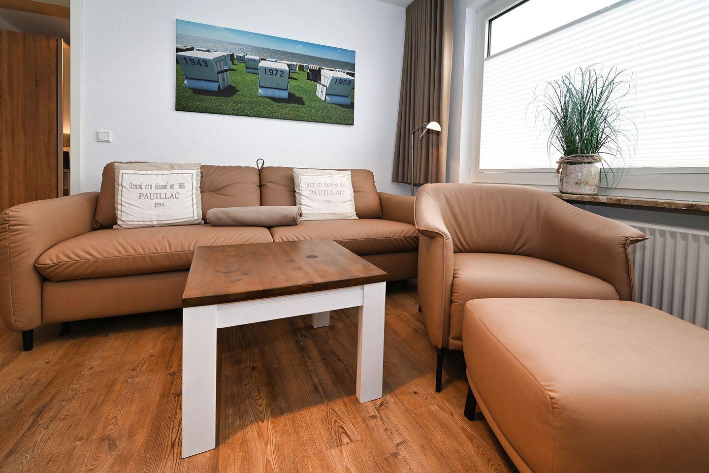 Mit einer Größe von 35 m² bietet die Ferienwohnung Platz für bis zu drei Gäste und überzeugt durch eine gelungene Kombination aus Komfort und Gemütlichkeit. Nach einem erlebnisreichen Tag am Strand können Sie sich auf das helle Wohn-Esszimmer zurückziehen. Hier erwartet Sie eine stilvolle Sofaecke, die zum Entspannen und Verweilen einlädt. Zudem ist die Wohnung allergikergeeignet, so dass Sie sich rundum wohlfühlen können.