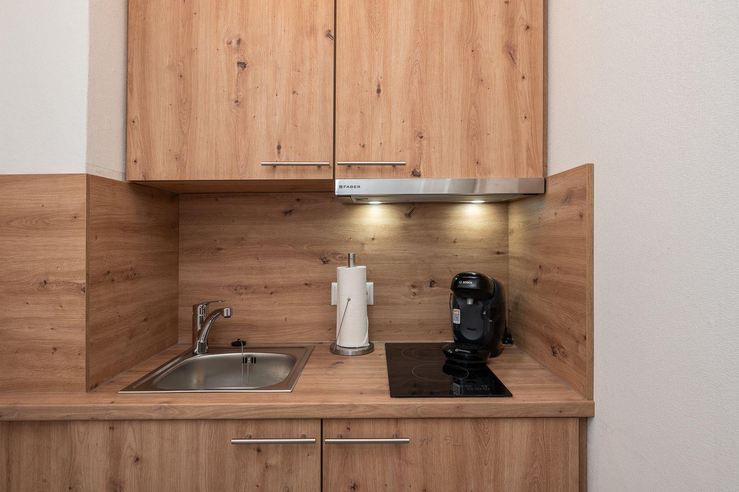 Die geschmackvoll ausgestattete Unterkunft liegt im 2. Stock und wurde im Jahr 2024 vollständig renoviert. Sie verfügt über einen gemütlichen Wohnbereich mit einem Essbereich, ideal für gemeinsame Mahlzeiten oder Spieleabende. Hier finden Sie einen Fernseher für entspannte Inklusiv-Nachmittage sowie kostenfreies WLAN, das Ihnen in dem ganzen Appartement zur Verfügung steht. Die Kochnische ist mit sämtlichen Küchenutensilien ausgestattet und verfügt über eine 2-Platten-Herd und eine Espressomaschine von Tassimo, sodass Sie auch im Urlaub nicht auf Ihren geliebten Kaffee verzichten müssen.