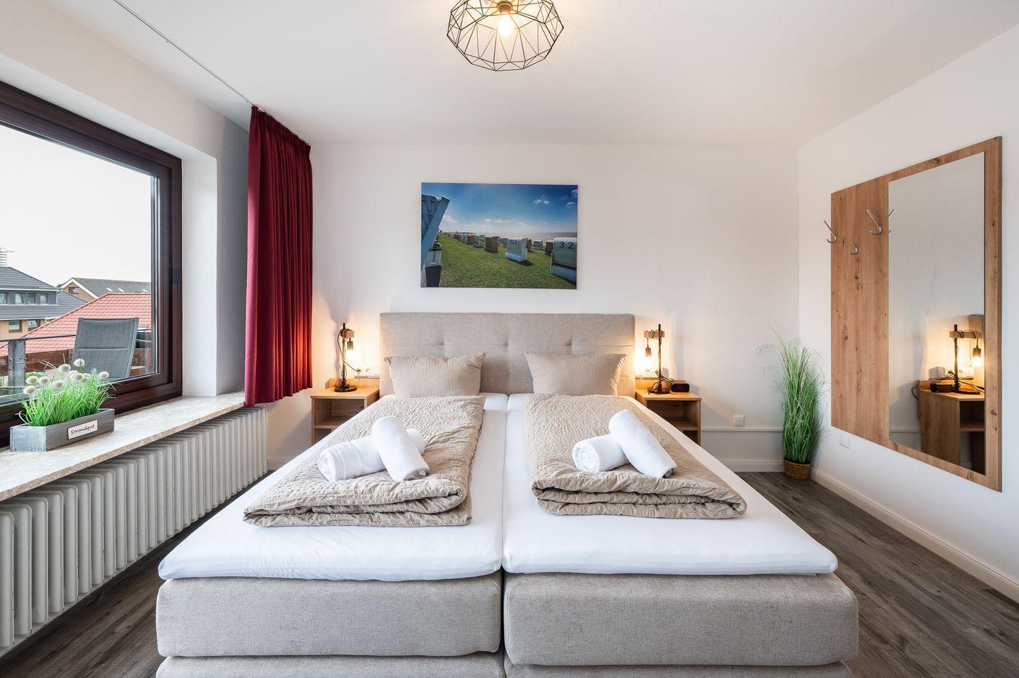 Das Schlafzimmer bietet Platz für bis zu zwei Personen und sorgt für eine erholsame Nachtruhe. Ein modernes Badezimmer mit Dusche und Wanne, Haartrockner sowie einem großen Ganzkörperspiegel lässt keine Wünsche offen und rundet das Wohlfühl-Erlebnis ab.