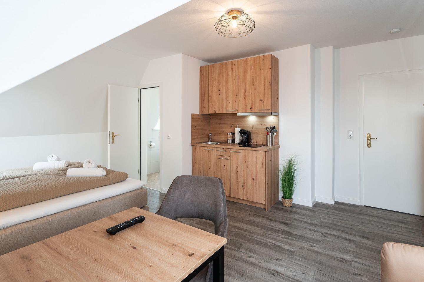Das Appartement befindet sich im 2. Stock und wurde im Jahr 2024 komplett renoviert, sodass Sie sich auf einen frischen und einladenden Wohnraum freuen dürfen. Das lichtdurchflutete Zimmer ist mit einer komfortablen Schlafmöglichkeit für bis zu drei Personen ausgestattet und bietet eine harmonische Atmosphäre zum Entspannen. Eine gemütliche Essecke lädt zum Verweilen und gemeinsamen Mahlzeiten ein. Die Kochnische ist mit modernen Küchenutensilien, einem Kühlschrank, einer Espressomaschine (Tassimo) und einem 2-Platten-Herd ausgestattet – ideal, um sich nach einem langen Tag an der frischen Luft mit selbst zubereiteten Speisen zu verwöhnen.