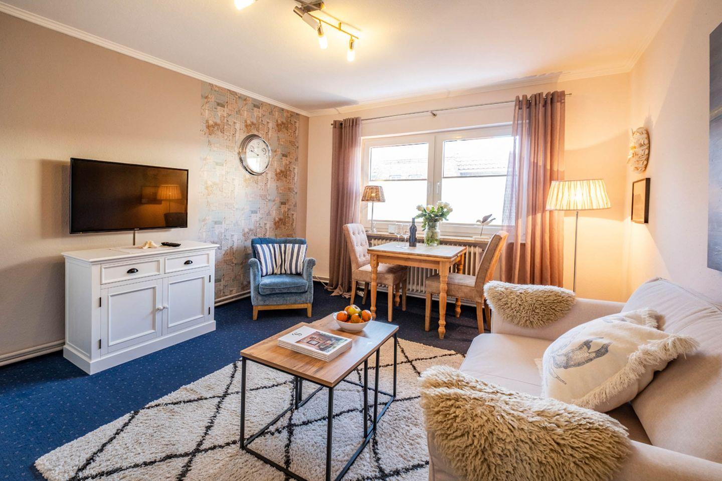 Das Apartment erstreckt sich über eine Etage und umfasst insgesamt zwei Zimmer, darunter ein komfortables Schlafzimmer mit einem bequemen Doppelbett, das für eine erholsame Nachtruhe sorgt. Der helle Wohnbereich ist mit einer Sofaecke ausgestattet, die zu entspannenden Abenden einlädt, und einem Esstisch, an dem gemütliche Mahlzeiten genossen werden können. Ein TV und Radio sorgen für die nötige Unterhaltung, während große Fenster für eine freundliche Atmosphäre sorgen.