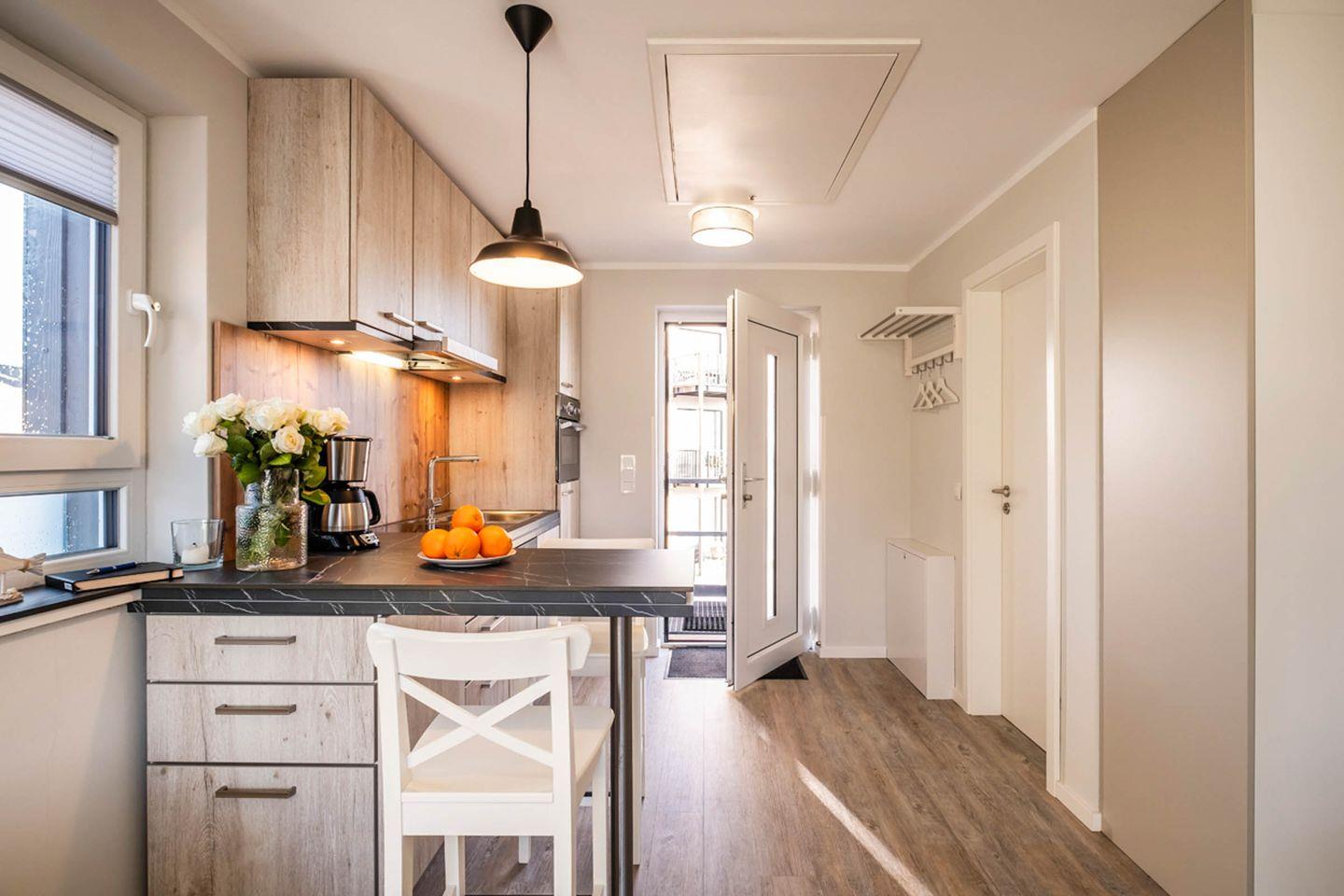 Die Wohnung verfügt über eine Wohn- und Schlafkombination. Die hochwertige Ausstattung der modernen Küche umfasst unter anderem einen Induktionskochfeld, einen Backofen, einen Kühlschrank mit Gefrierfach sowie eine Spülmaschine. Dank einer Vielzahl von Küchenutensilien, einer Kaffeemaschine, Toaster und einem Wasserkocher können Sie Ihre Lieblingsgerichte im Handumdrehen zubereiten. Ein Esstresen steht ebenfalls zur Verfügung, um gemeinsam zu speisen und den Tag Revue passieren zu lassen.