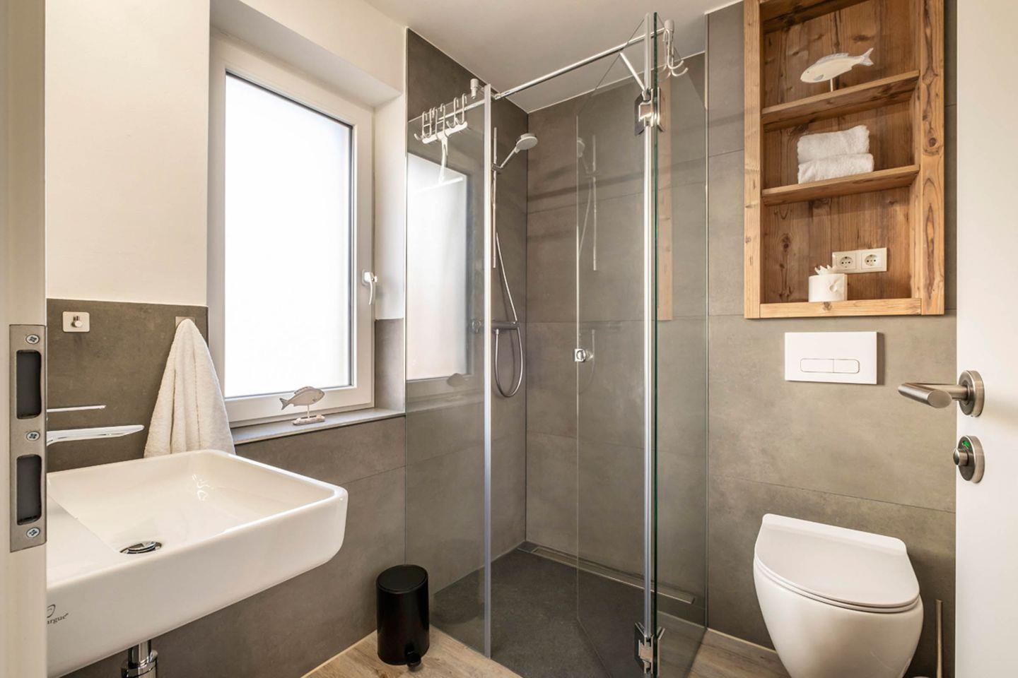 Das moderne Tageslicht-Bad ist mit einer bodengleichen Dusche, einem Waschbecken und einem WC ausgestattet sowie einem Handtuchheizkörper und vielen Ablagemöglichkeiten. Es bietet alles, was Sie für einen erfrischenden Start in den Tag benötigen. Alle Zimmer verfügen über eine Fußbodenheizung
