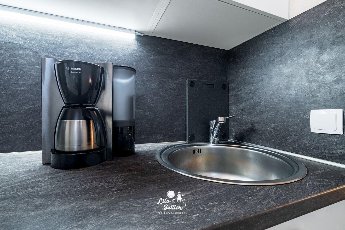Ceranfeld mit zwei Kochfeldern, Kühlschrank mit Gefrierfach, Mikrowellen-Grill Kombi, Geschirrspüler, Kaffeemaschine, Wasserkocher, Toaster