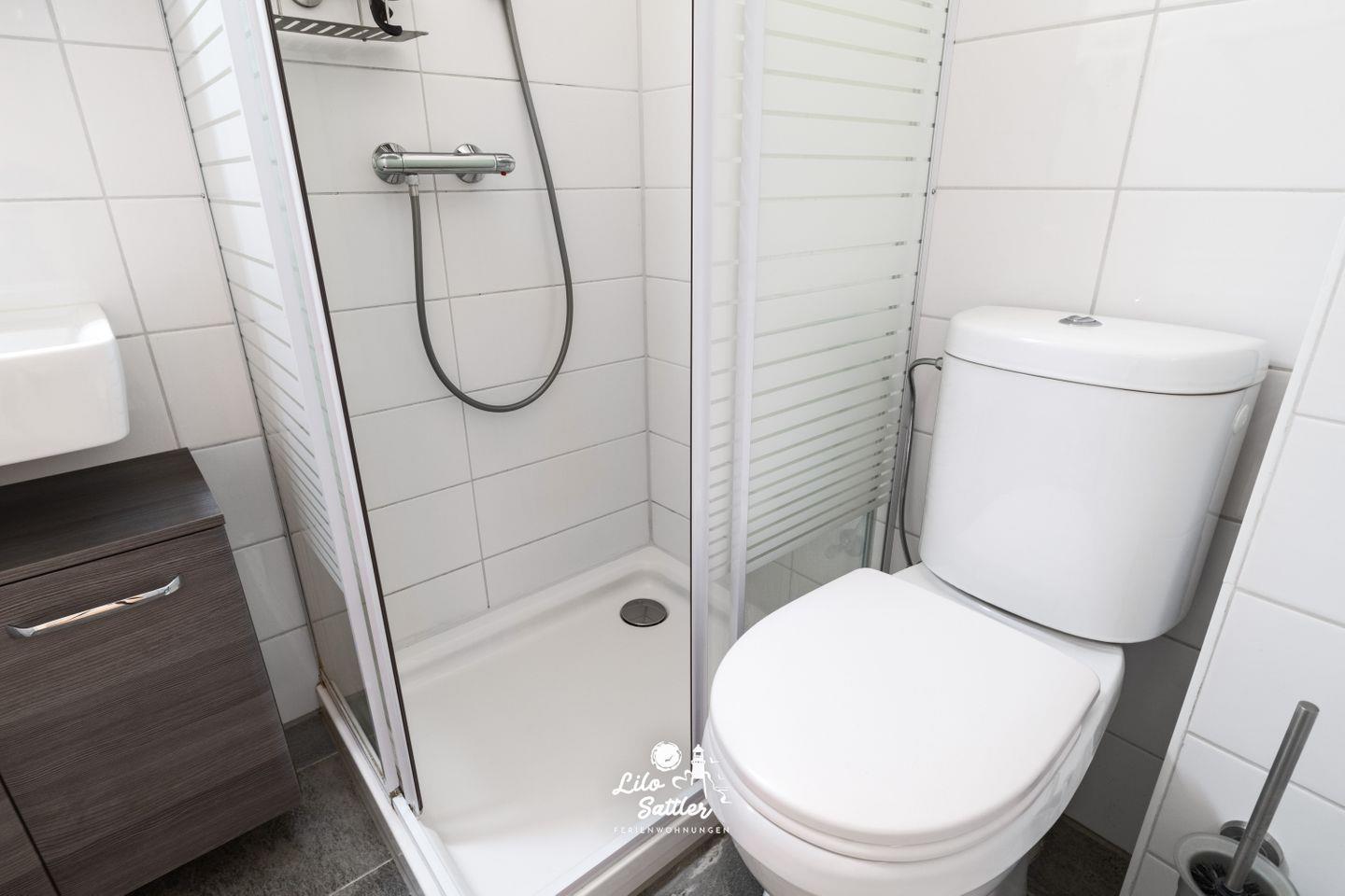 Dusche, Waschbecken mit Unterschrank, Spiegelschrank, WC, Handtuchwärmer, Föhn, Lüfter